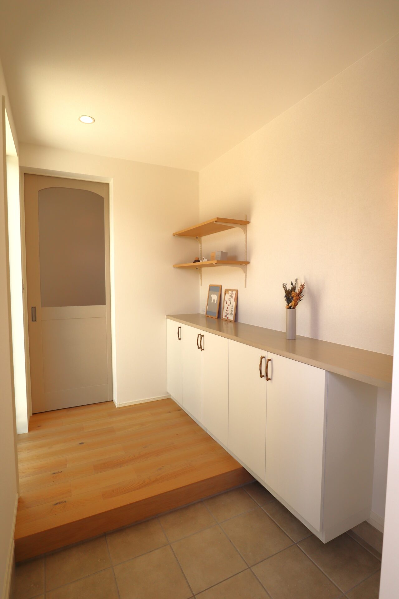 玄関はタイルテラスから外光が差し込む