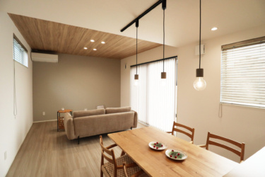 将来も見据えた1階の寝室に加え、折上げ天井を採用したリビングは、開放感あふれる心地よい空間に。