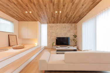 勾配天井になっているリビングは、家全体に開放感をもたらします。