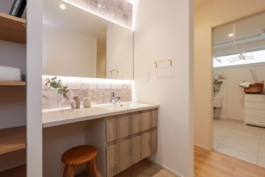回遊できるキッチン動線と、脱衣室・洗面・収納が近接した家事ラク設計で、忙しい毎日も無理なく回る住まいです。