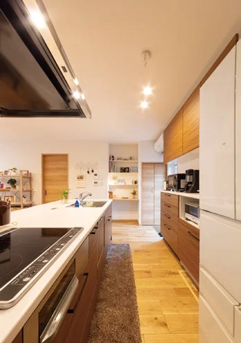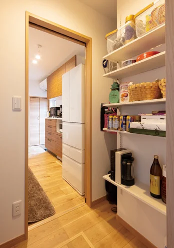奥様キッチン横のパントリーは玄関にも近く、買い物後の収納も楽チンです。ワンちゃんが走り回っても滑らないようにムク材のフローリング床にしました。