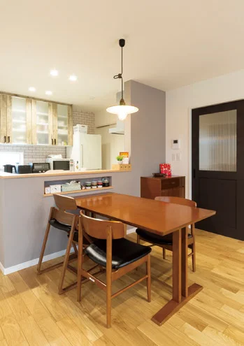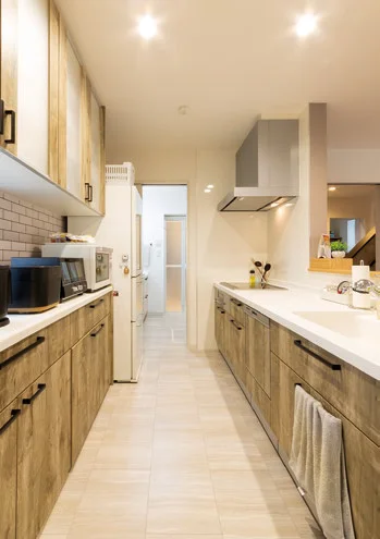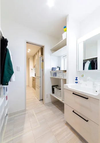 広い家は掃除が大変なので、コンパクトながら広がりがあって、動線も機能的な住まいにしたいと思い、自分たちでプランを考えました。特にこだわったのが、キッチンを中心に洗面脱衣室・LDK・サンルームを回遊動線で結んだ間取りです。私が朝早く仕事に出かける事もあるので、家族を起こさずに済むように洗面脱衣室に自分専用のクロークを設けました。
