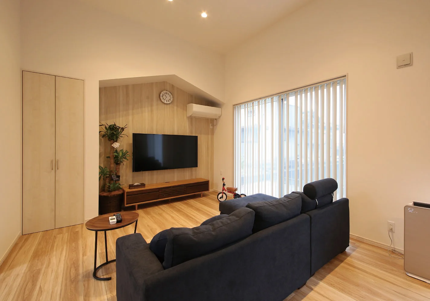 TV後ろの三角壁は「家の中にある家」をイメージしました。LDKは高天井と大きな窓で実際の面積以上に広く感じます。室内は床暖房だけで十分暖かくて、天気のいい日は窓からの光だけでも、部屋の中がぽかぽかと暖まるんです。