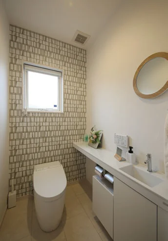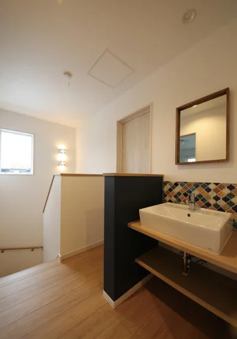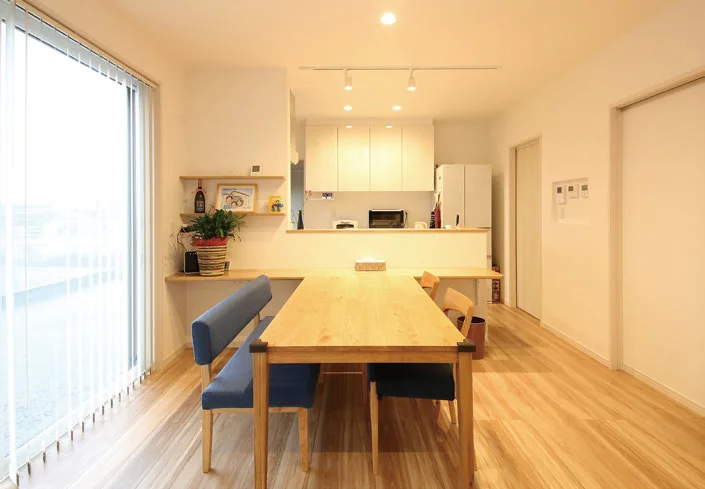 奥様キッチンの奥に水回りとファミリークローゼットをまとめた間取りは、家事・育児・仕事に追われる日々の中、心強い味方になっています。また、子どもがケガをしないようにキッチンカウンターの角を丸くして安全に配慮しました。