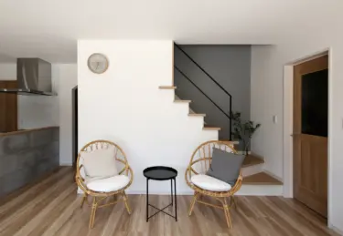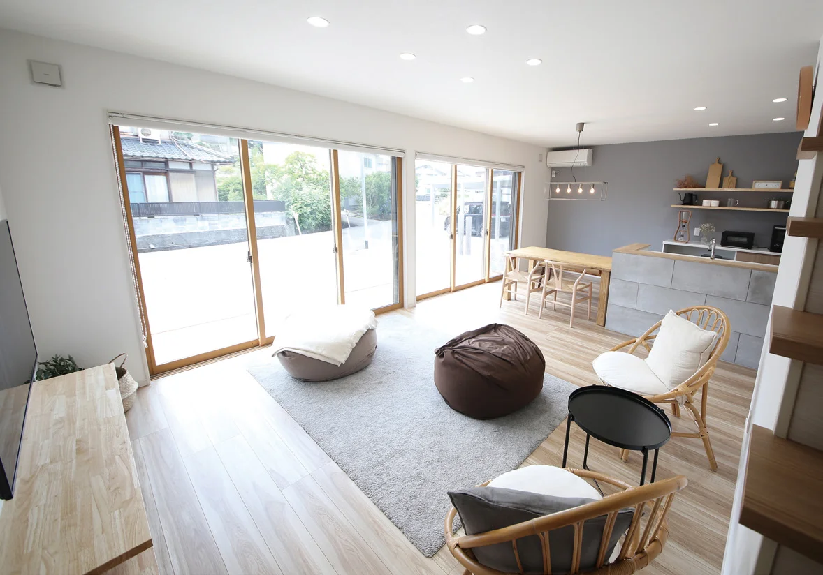 奥様収納を増やすと物が自然と増えてしまうので、収納は最低限にしました。広さを優先させるため、ソファーではなくクッションを置きました。