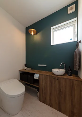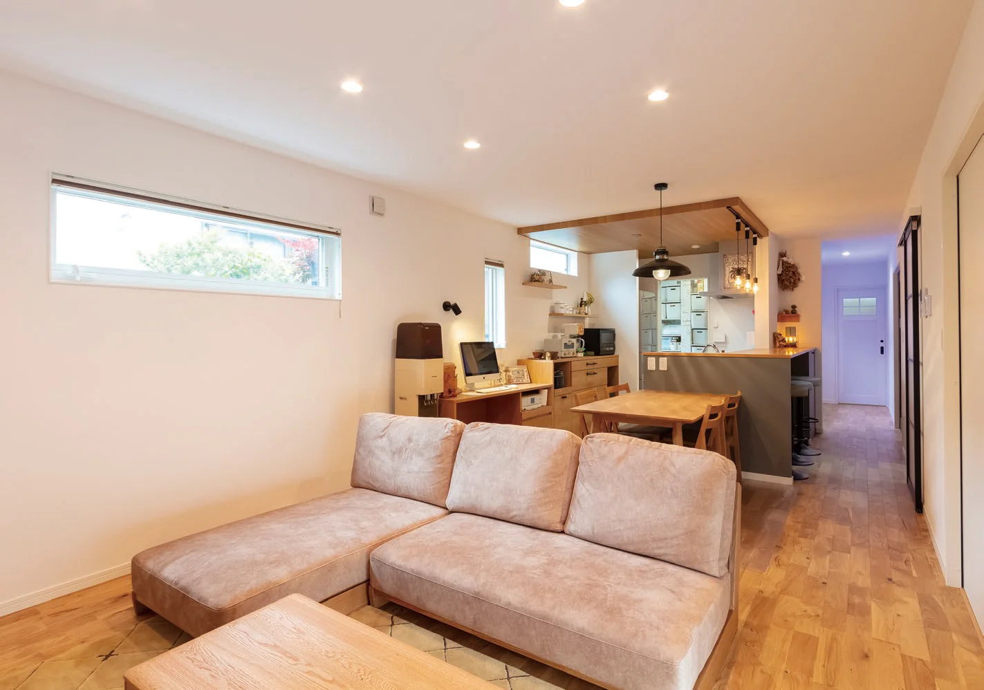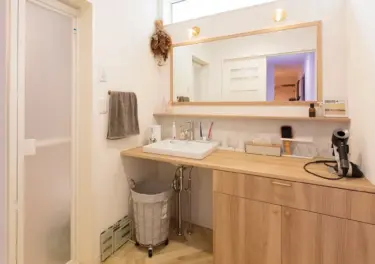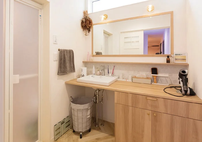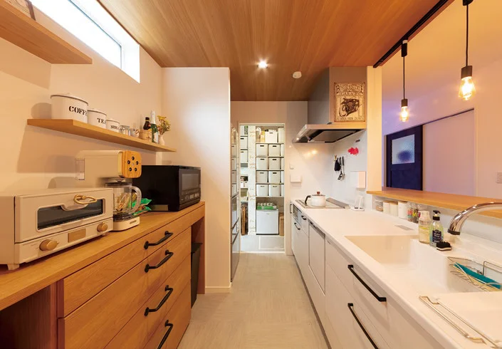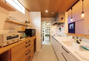 奥様LDKに馴染むお気に入りの家具は、インテリアショップにトータルコーディネートして貰いました。洗面台やトイレの手洗い等は色や大きさまで念入りにリクエストして決めたオーダーメイドです。キッチンそばは、パントリーとクローゼット、水まわりを一つにまとめ使い勝手のよい動線にしました。