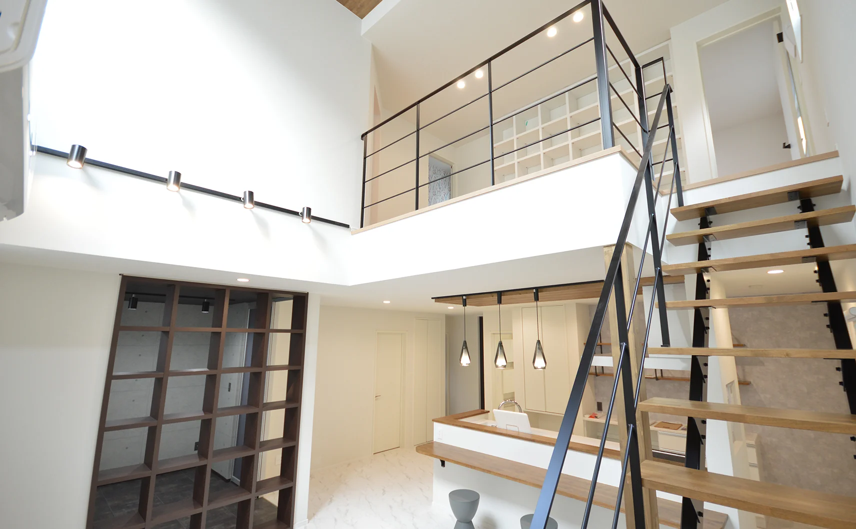 造作収納付きTVボードと組み合わせた階段のステップから延びる鉄骨階段がデザインとして空間を印象付けます。トレーニングルームや2Fホールのフリースペースが生活に余裕をもたらします。