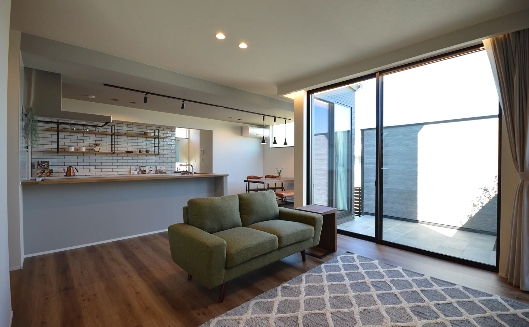 分譲地ながらプライベートテラスを設けることで、明かりと解放感を演出したLDKのある家。