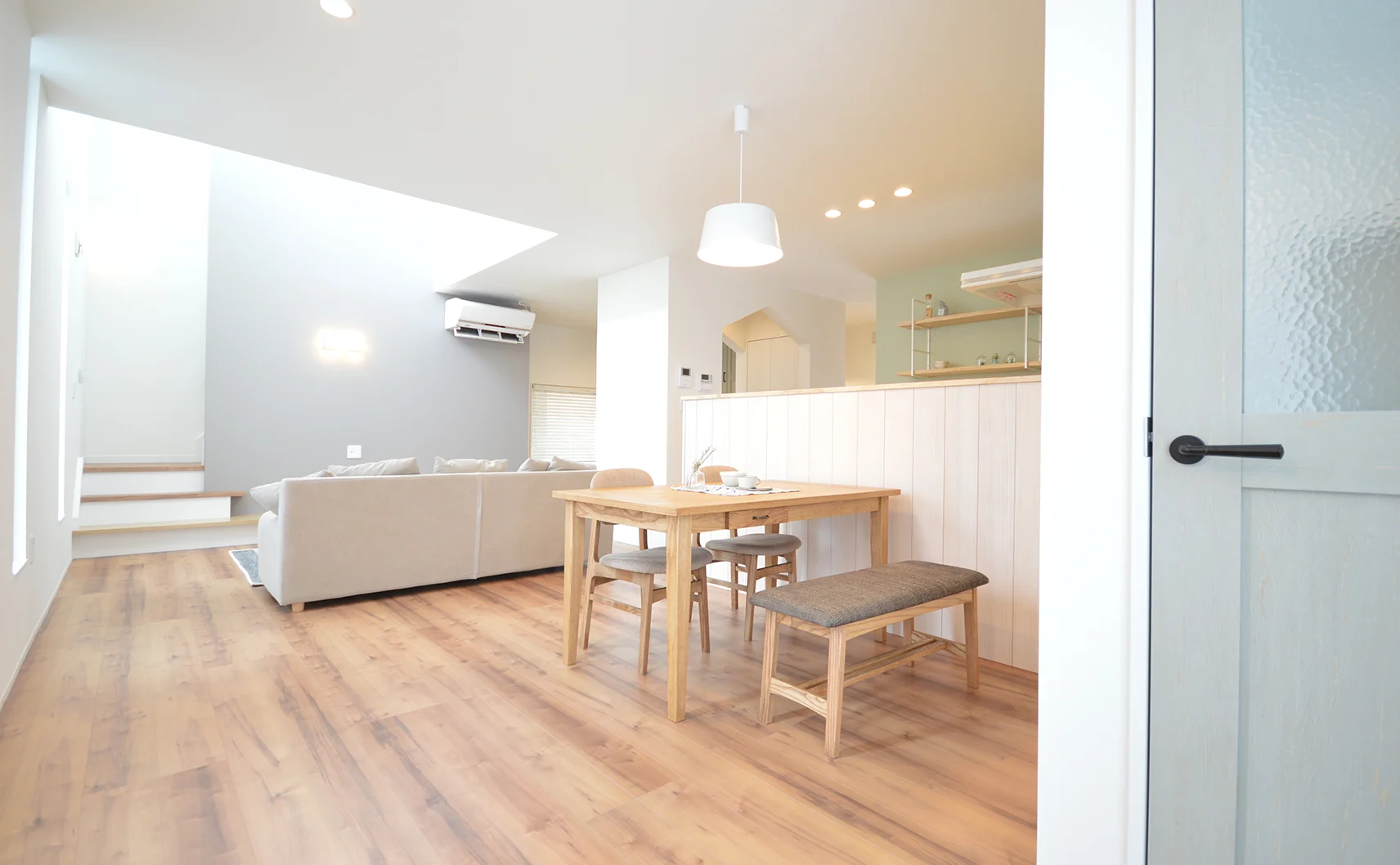 家という大きい枠に囲われる、目隠し壁のキッチンに囲われる、柔らかく囲われた和室。分譲地という立地を活かし、プライベートを囲いながら明るく、機能的に暮らす家。