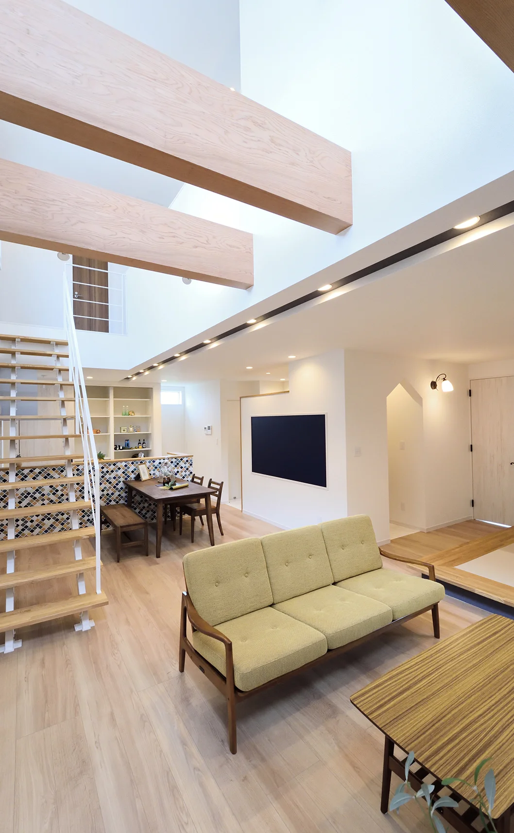南側は家が建っている立地条件で、吹抜けを細長く計画し、1階に大きな窓を設けずプライバシーを保ちながら明るいLDKとしました。