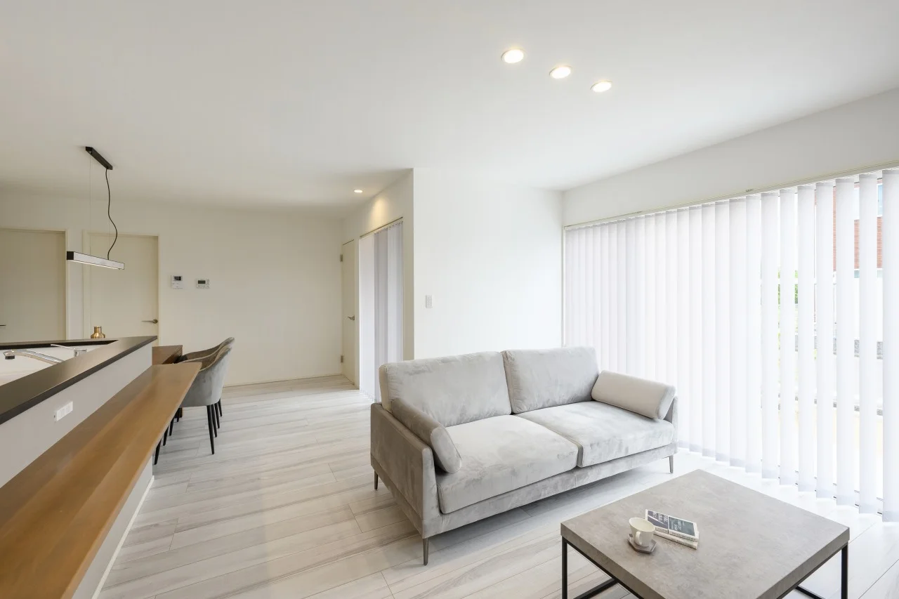 木目を効かせつつ、白い内装で光の反射を狙った、明るい平屋建て。