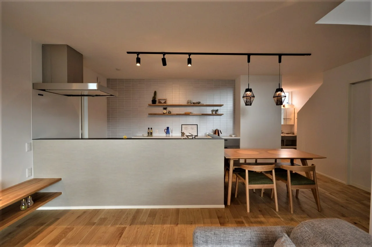 オークを使ったナチュラルテイストの空間に、照明、笠木、家具などの黒いアクセントが映える空間の家。
