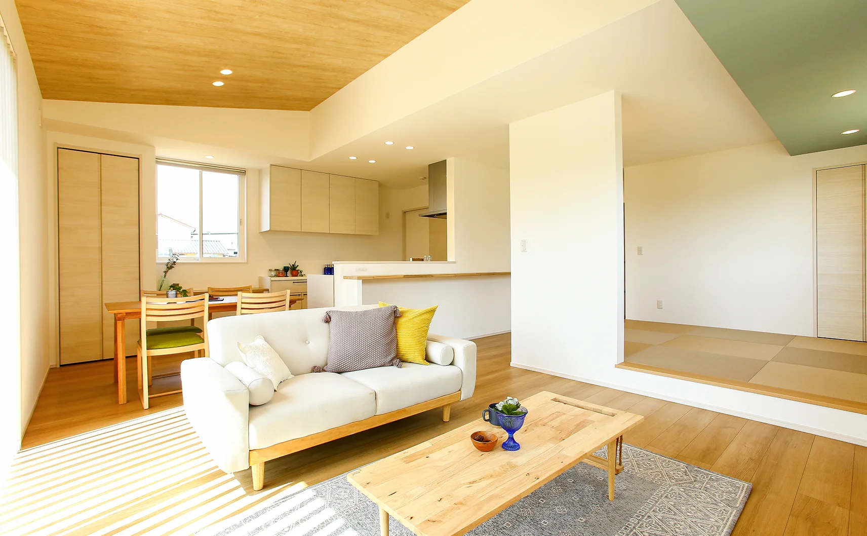 リビングの天井をわざと造作で変化をつけ、バランスの良い色合いでまとめた空間が特徴的な家