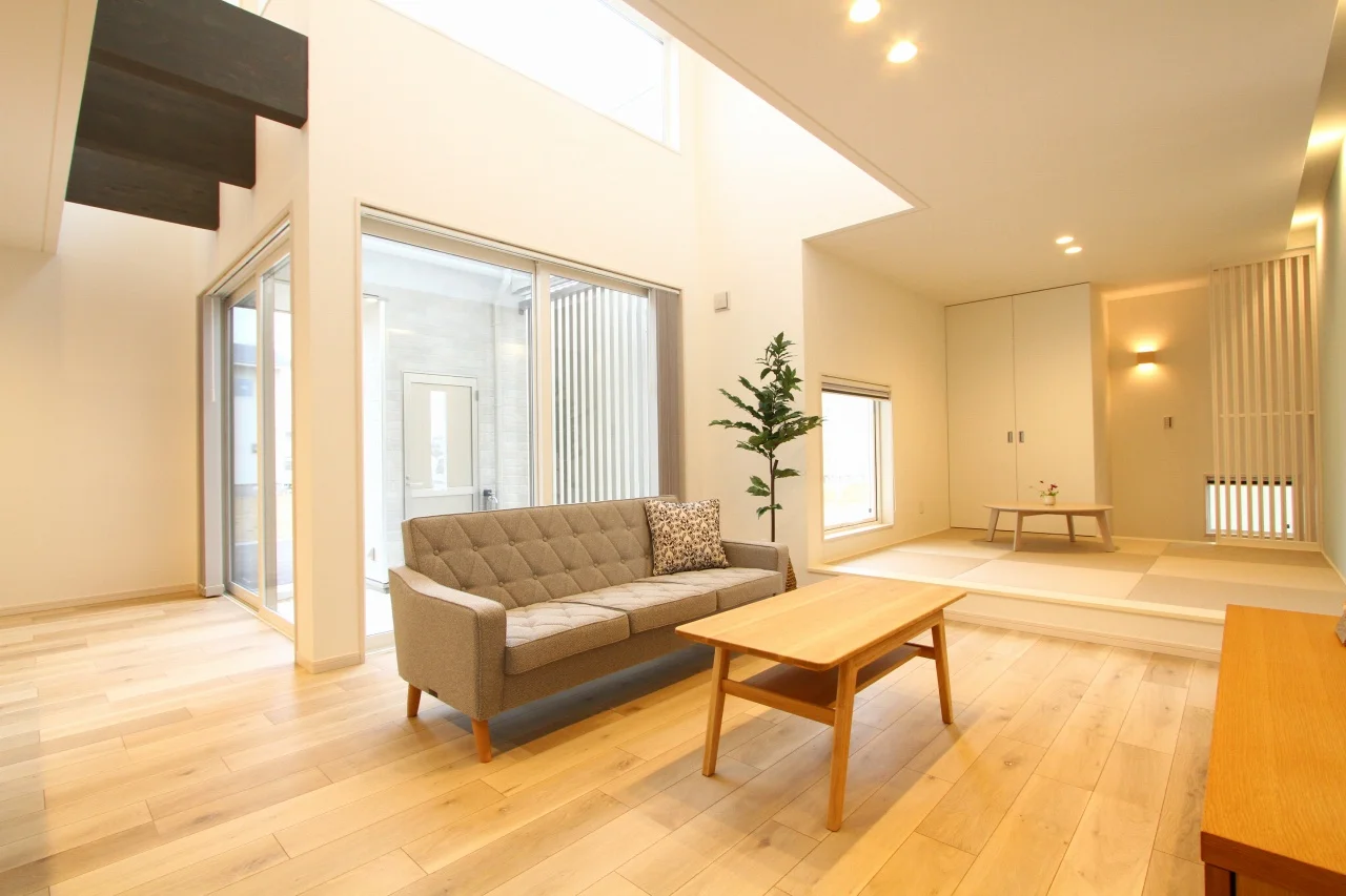 L字に配置された吹抜けからLDK全体に光が入ります。リビング・ダイニングからは囲まれたテラスが見え、格子で目隠しされているのでコートハウスの仕様に。プライベートテラスも備えた家。