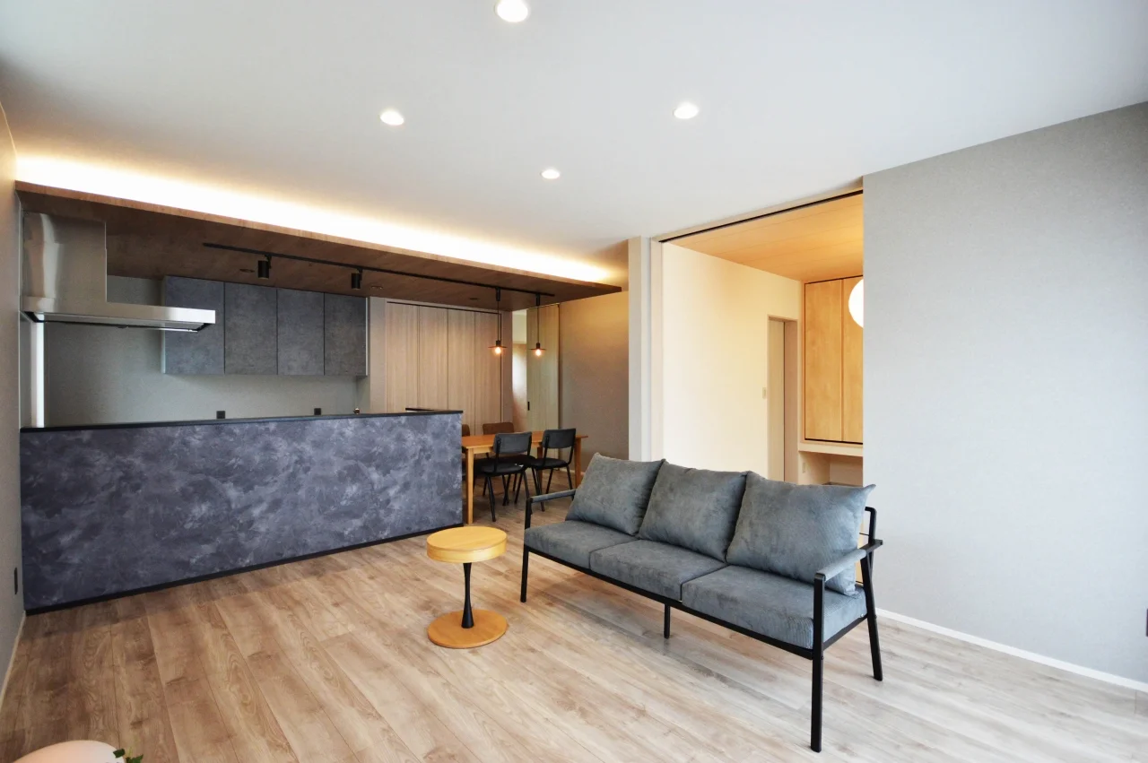 グレーの内装と、ところどころ無機質な質感を取り入れ、アクセントの木目が引き立つ空間に。