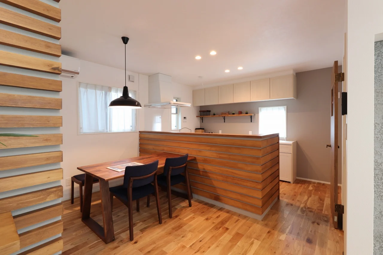 「禅」をベースとした効率の良い間取りに角材のルーバーや木の板張り、梁現しといった連続性のあるデザインで表現。