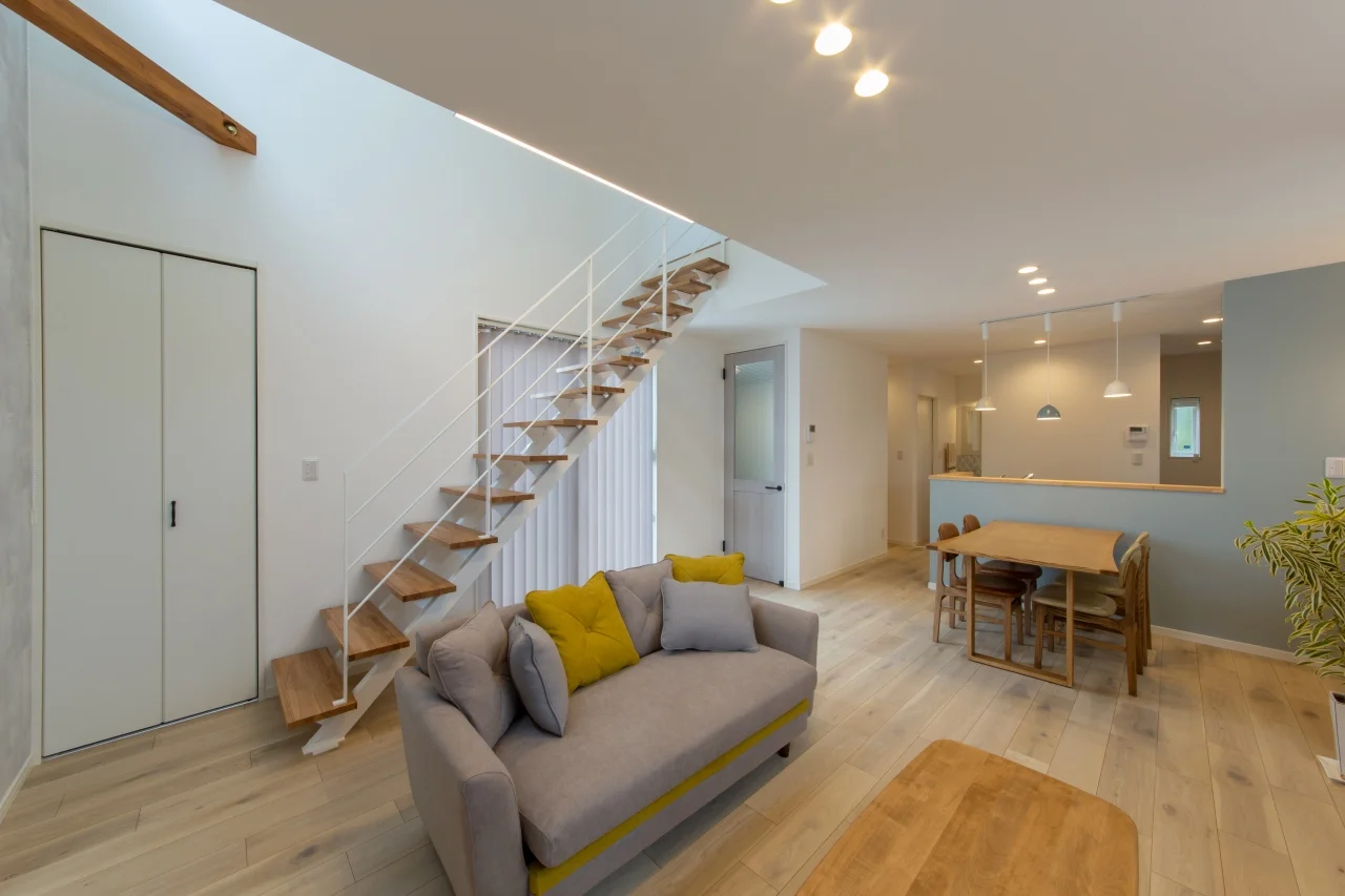 移動手段である階段をリビングの強いデザインとして取り入れた空間