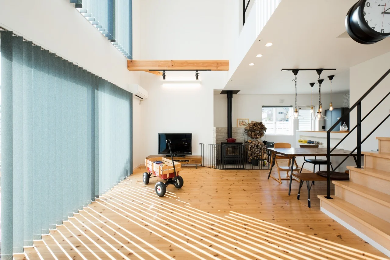 シースルーの鉄骨手摺を設け、開放的な空間に。開放的でも薪ストーブのある空間で冬場もとても快適に。