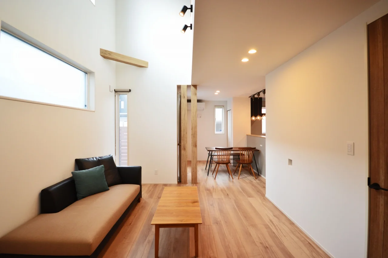 玄関→シューズクローク→洗面・トイレ→ランドリー→キッチンが一直線の動線で実現し、帰ってからの動線がとてもスムーズな間取り。