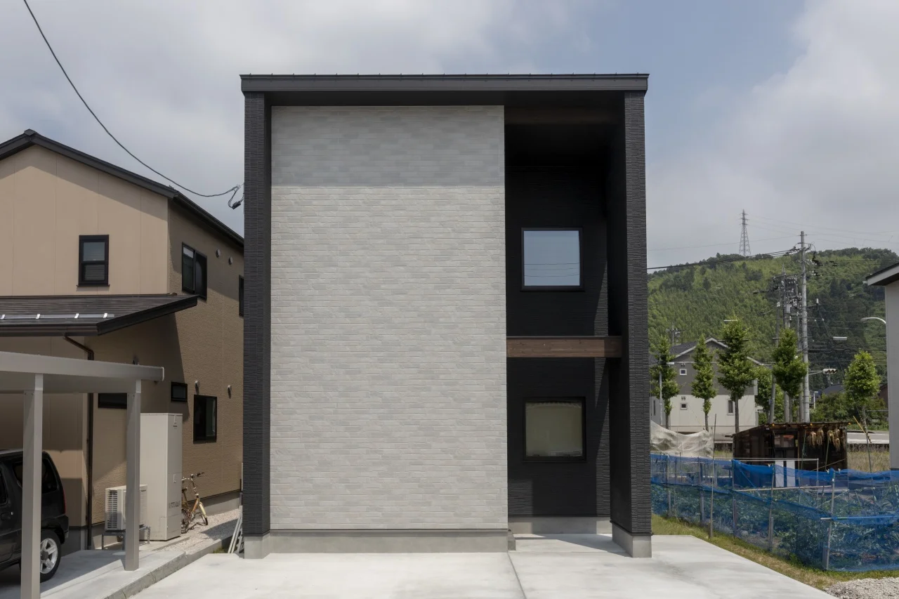 一枚の壁を立てたようなデザインが目を引く外観のお家。正反対に中は開放的で明るい空間。