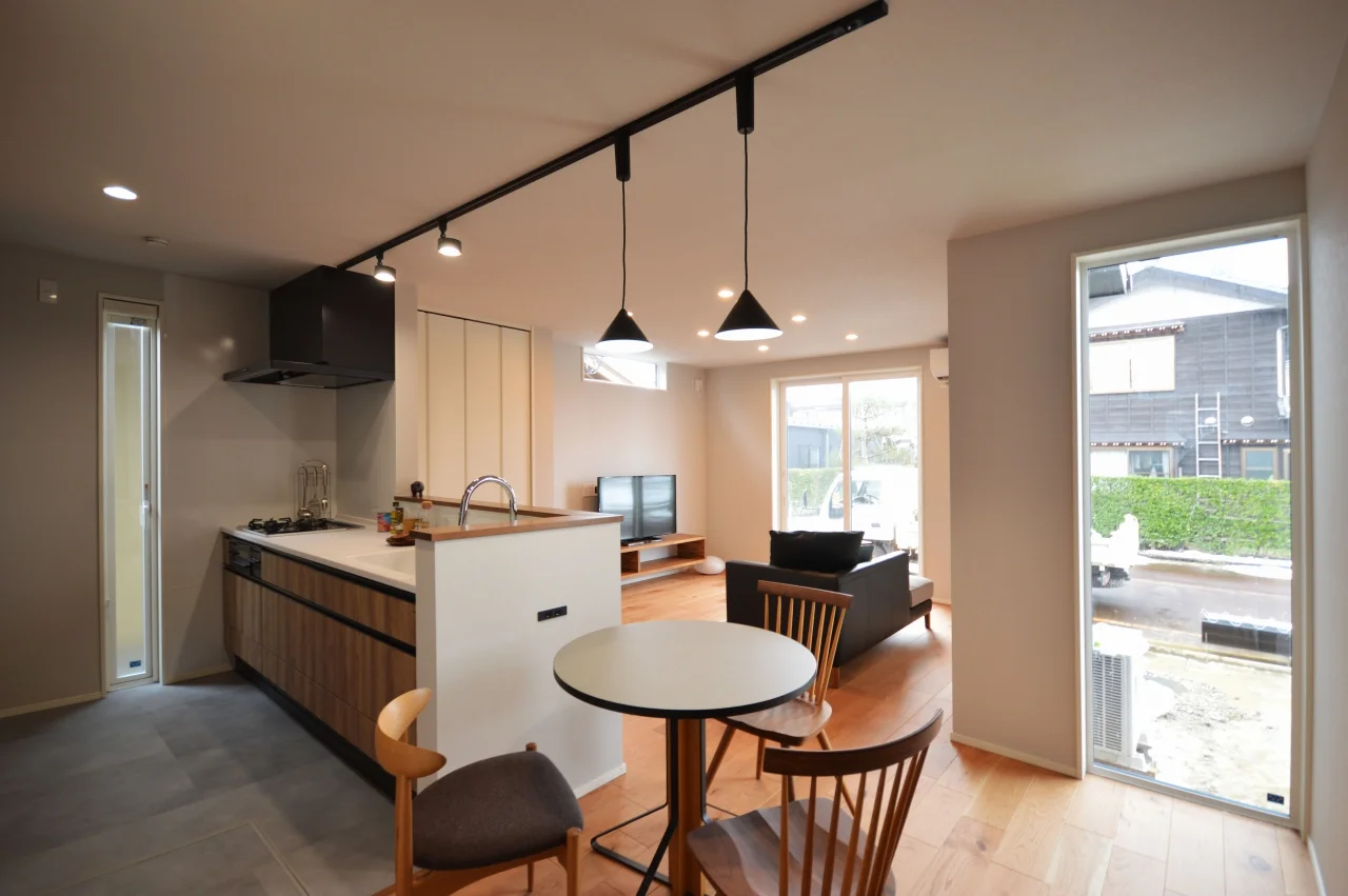 ところどころブラックの部材で空間を引き締め、リビングの入口にはブラックのガラス戸を採用し、高級感もプラス。
