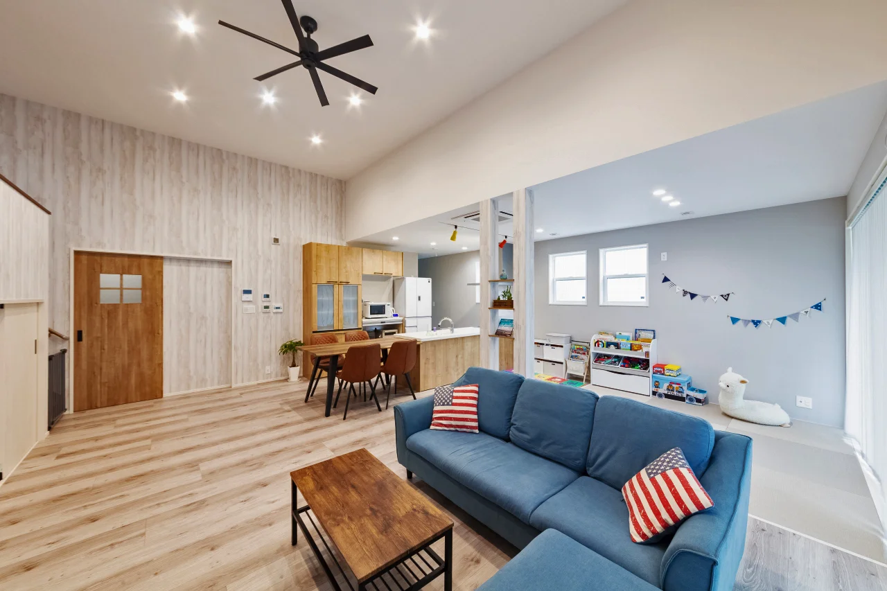 和室を開放した広いLDKに加え、平屋ならではの屋根の高さを利用した天井高でさらに開放的な空間に。