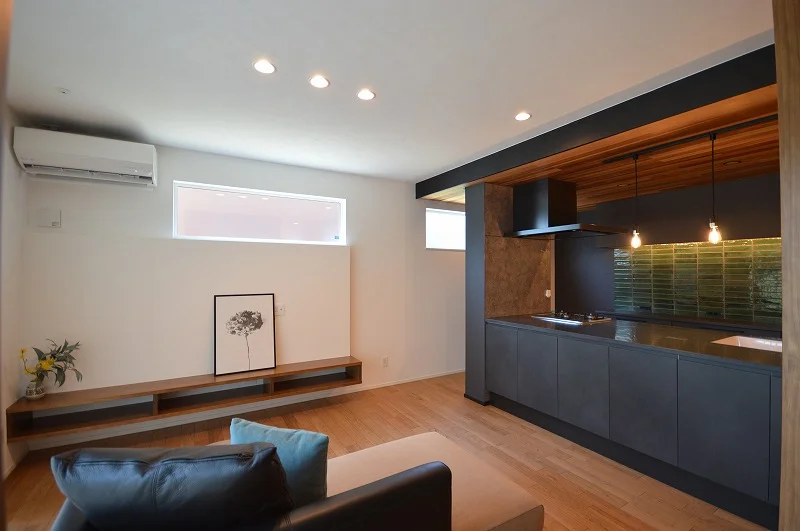 キッチンは木目天井と黒のコントラストが印象的で、家族の団らんを演出します。