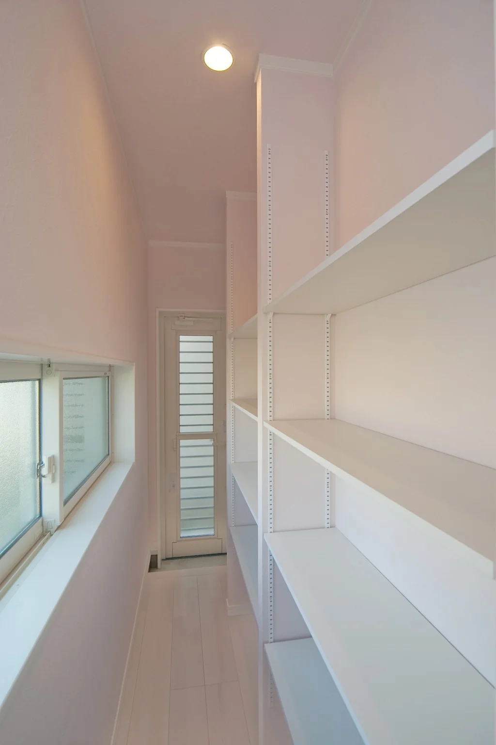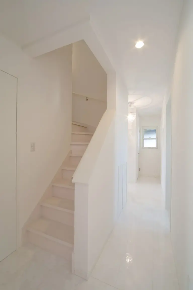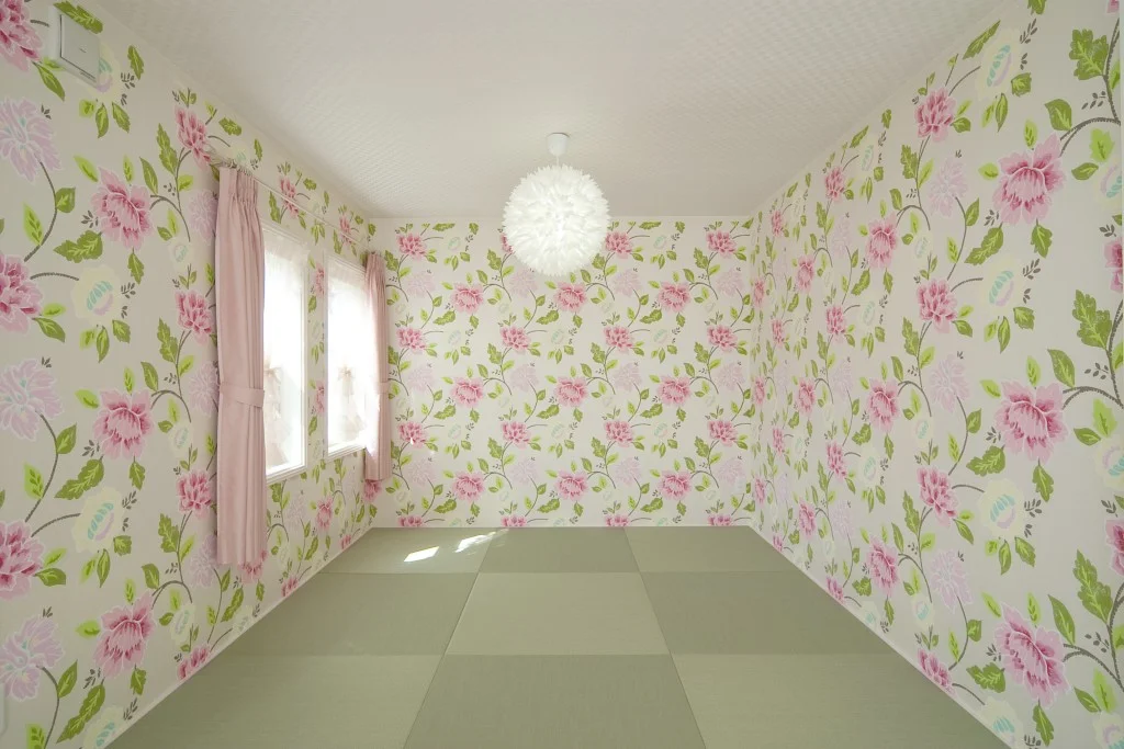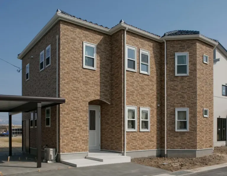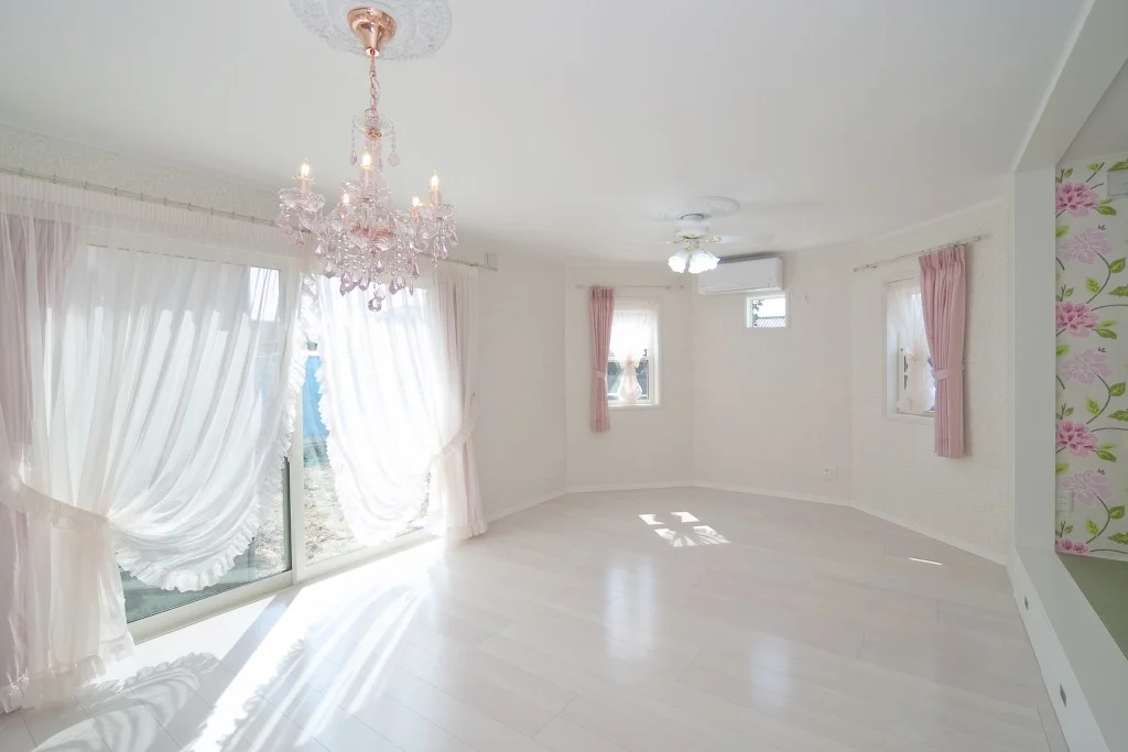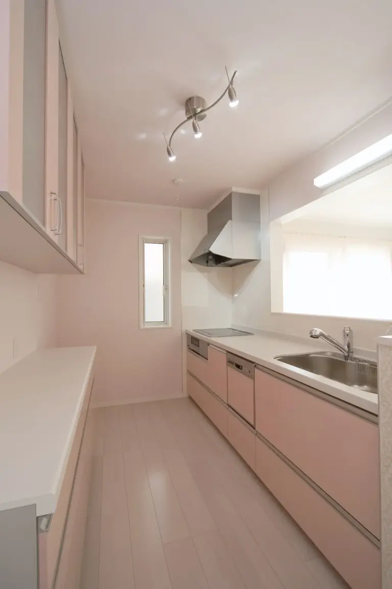 タイル調の外壁が、重厚感と高級感の漂う素敵な住まい。 室内は外観とは異なり、ホワイトを基調とし明るさと開放感を演出。 ピンクのキッチンがアクセントカラーとなり、空間に可愛さをプラスします。 アーチ状の下がり壁を多用することで、アンティーク感も備えました。