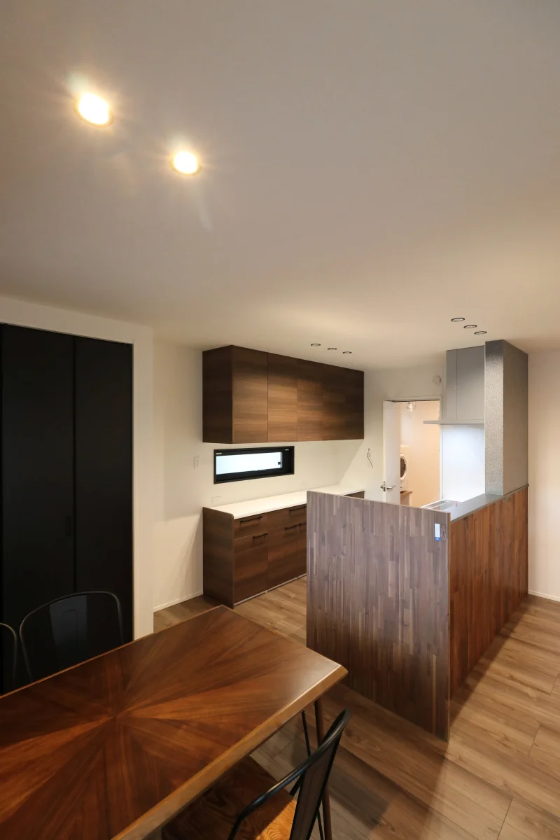 キッチンの立ち上がりを個性のある木とカウンター材で造ることでインテリアキッチンが中心となる空間に。