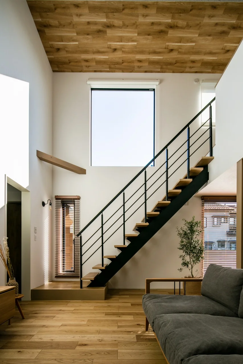 ブラック色で構成されたストリップ階段が目を引く空間。多目的な土間空間を加え、開放的な暮らし。
