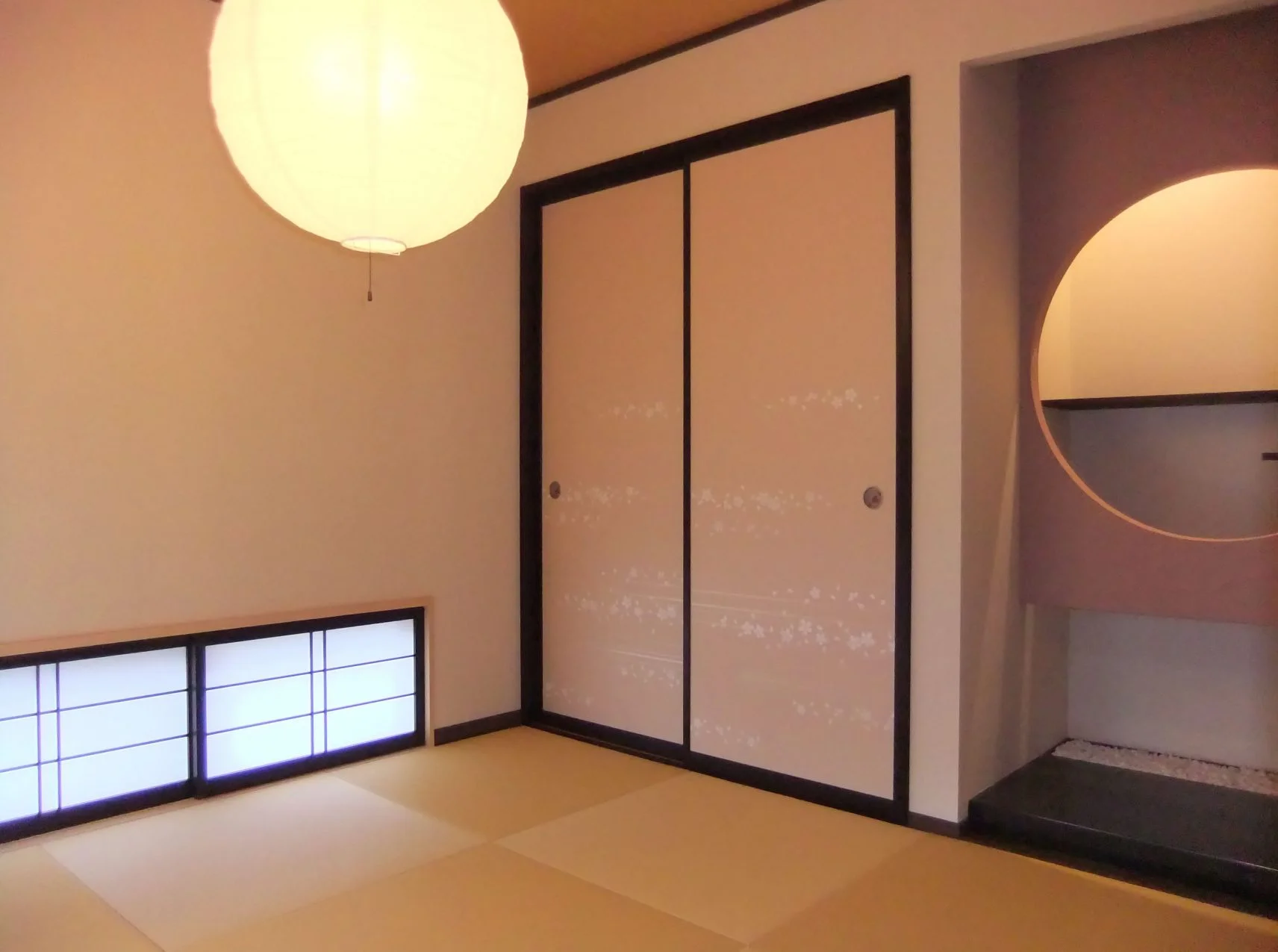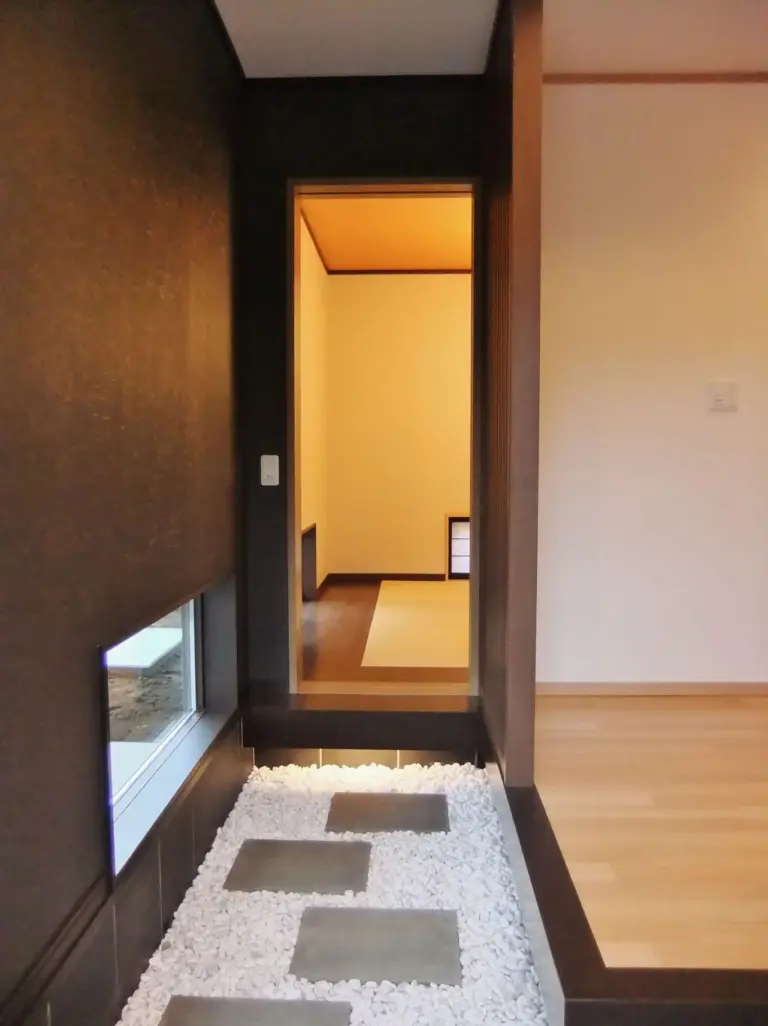 玄関を開けると、カランカランと下駄の音が響いて来そうな玉砂利を敷き詰めた玄関、そしてその奥にはしっかりとぬくもりのある和室。「家族一人一人の想いはそのままに」そんな愛情を思い切り感じることのできる住まい。