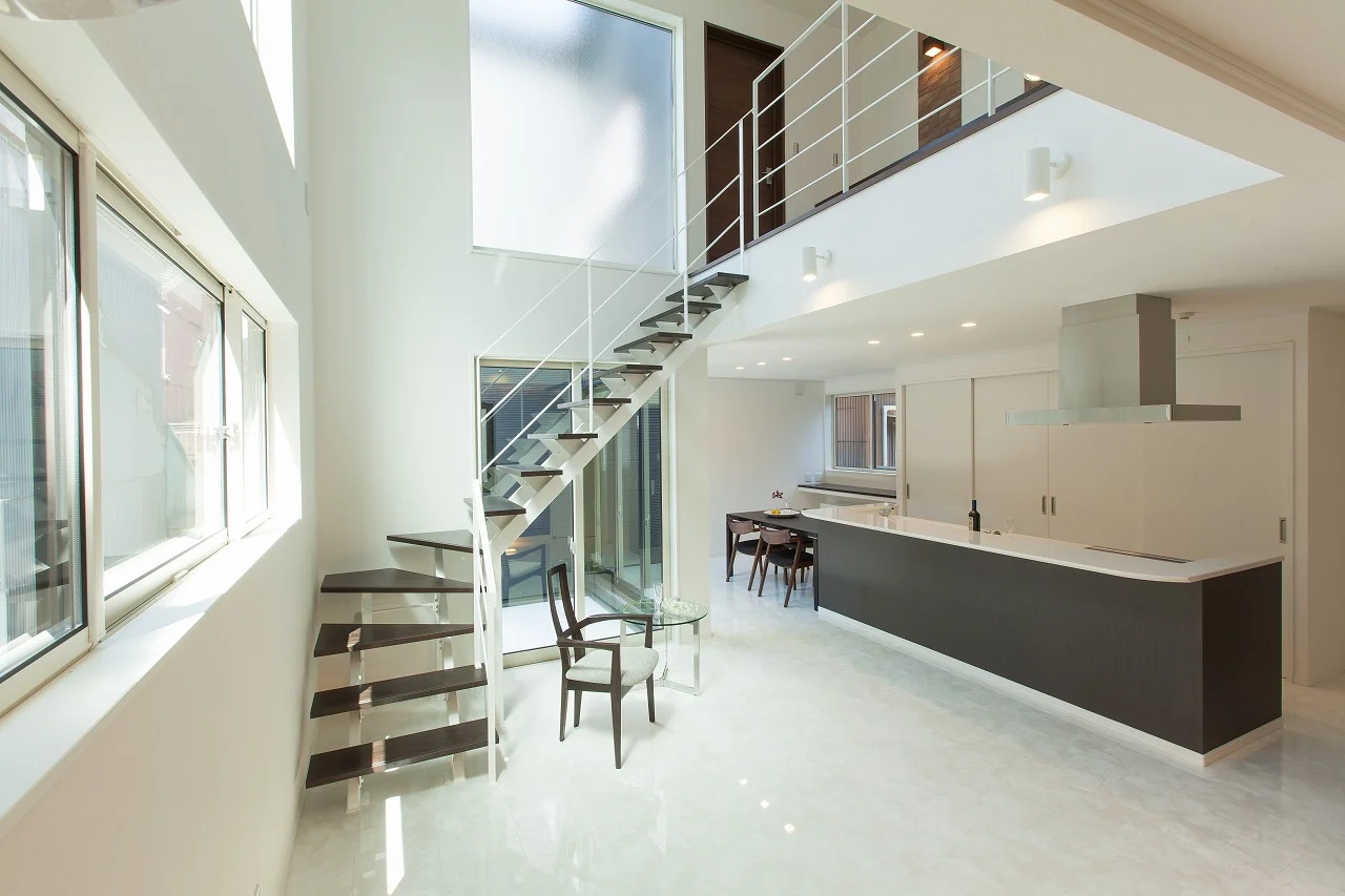 白を基調としたモダンなデザイン。吹抜や間接照明、スケルトン階段などがスタイリッシュで開放的な空間を演出。来客用と家族用の2つに分けられた玄関や、2階ホールを利用した開放的なスタディスペースなど、こだわりのアイデアが満載のお住まいです。