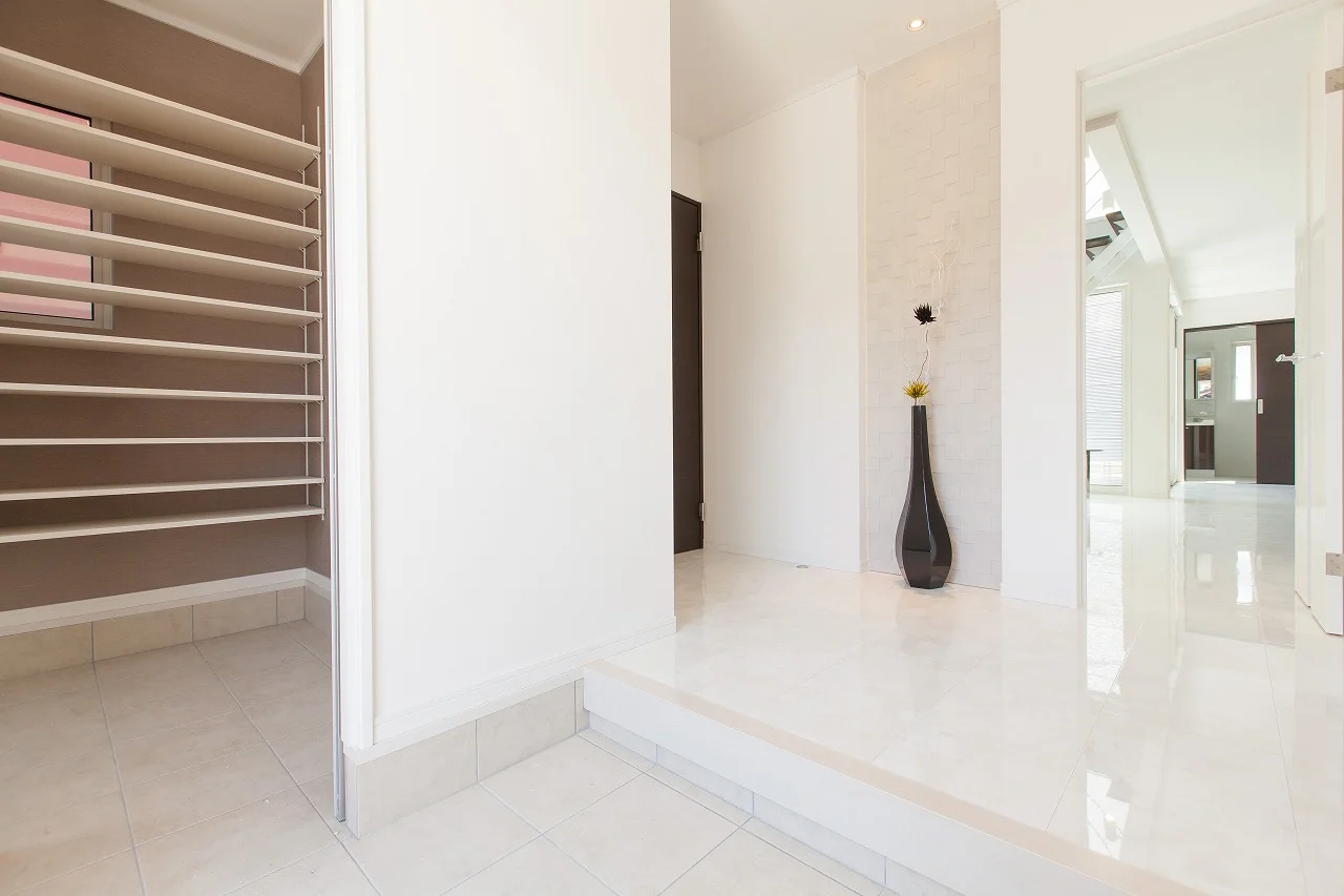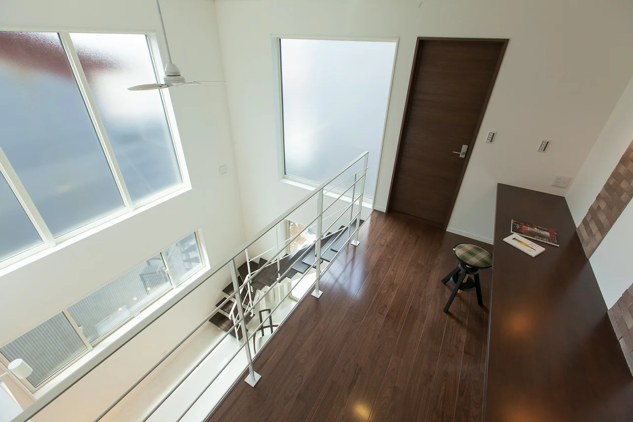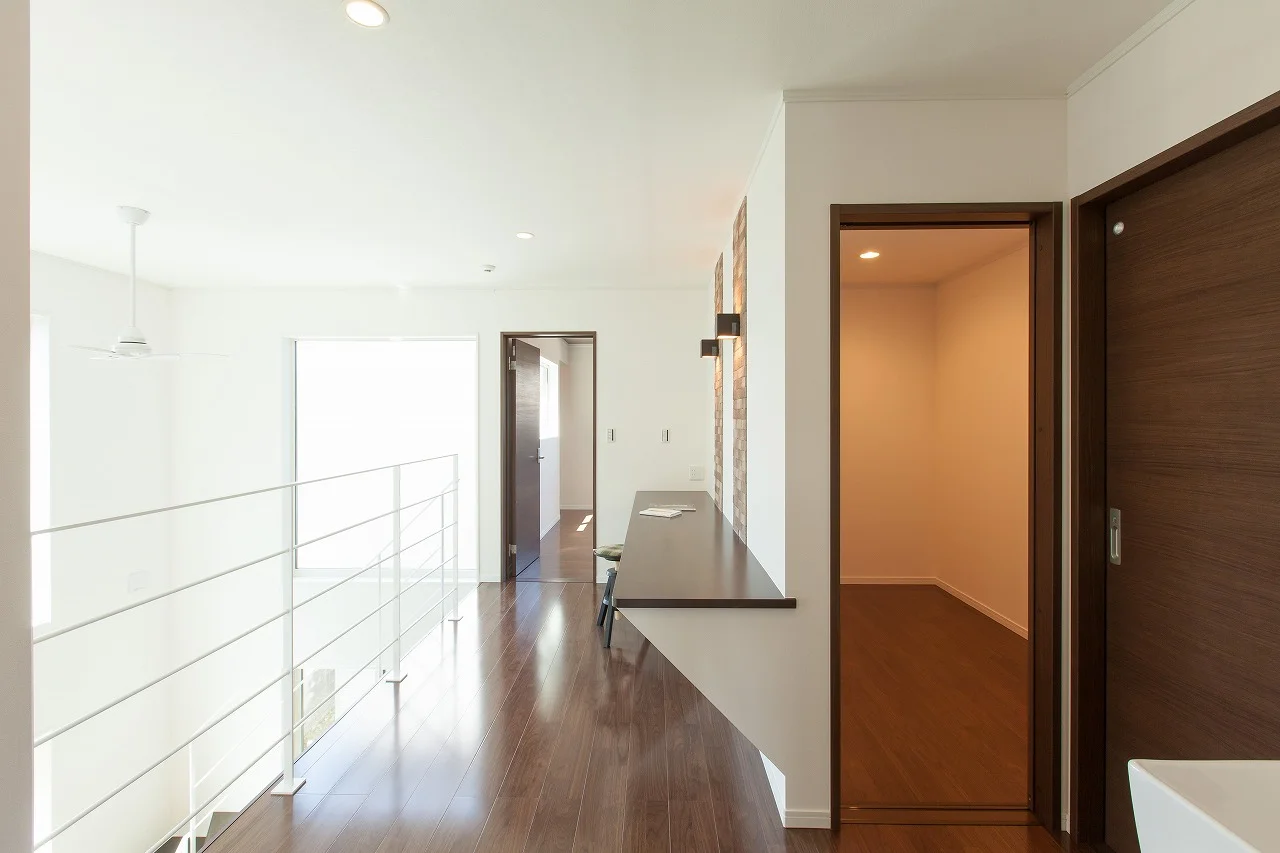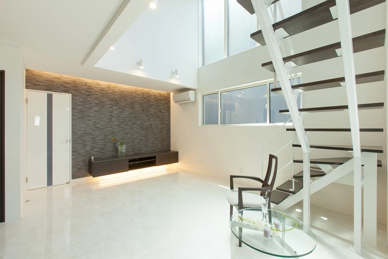白を基調としたモダンなデザイン。吹抜や間接照明、スケルトン階段などがスタイリッシュで開放的な空間を演出。来客用と家族用の2つに分けられた玄関や、2階ホールを利用した開放的なスタディスペースなど、こだわりのアイデアが満載のお住まいです。