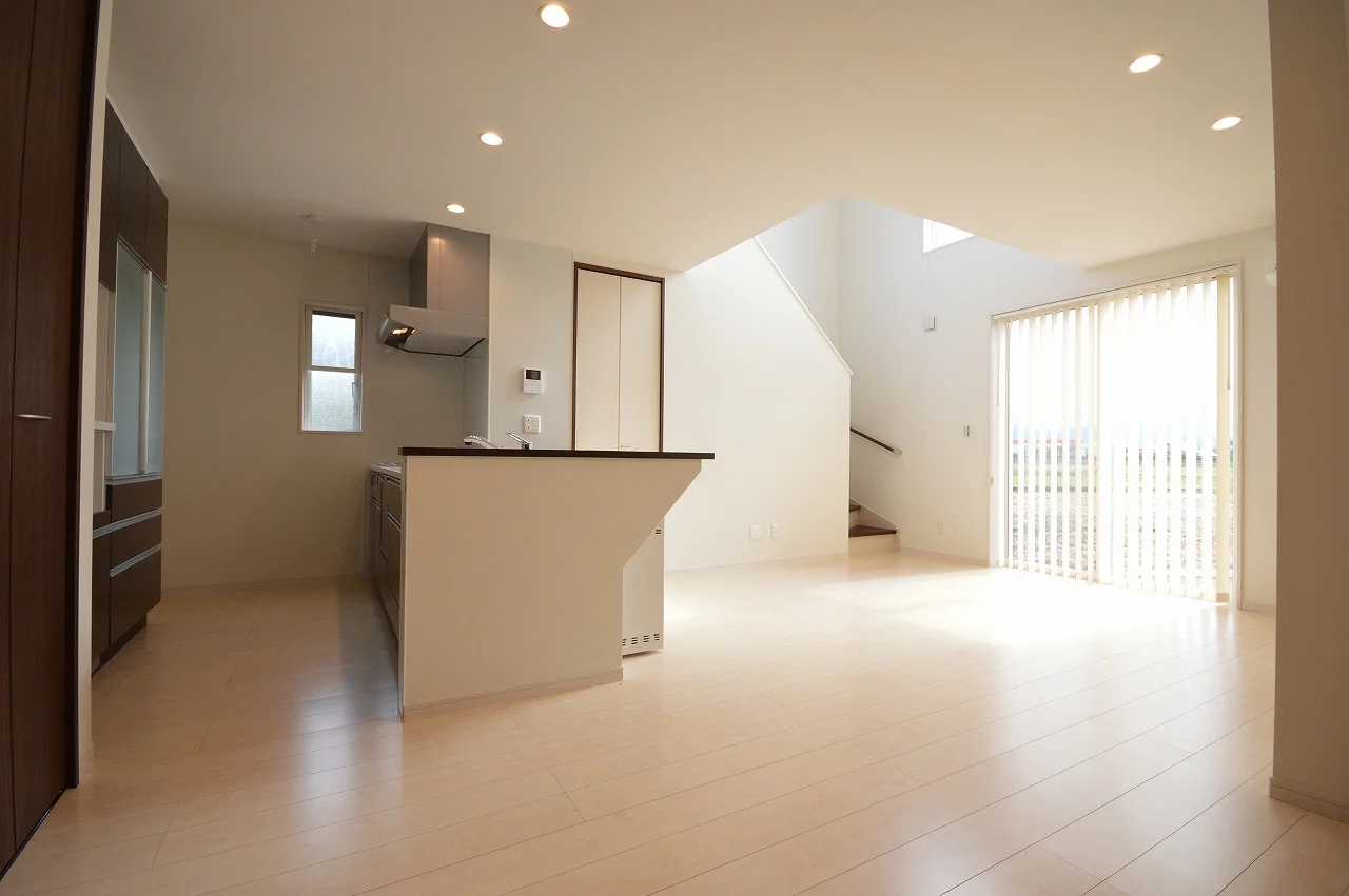 シンプルな箱型の外観。あえて仕切らない畳コーナーと吹抜けによる開放的な空間、一直線につながった水周りの機能的な間取りが特徴的なお家になりました。