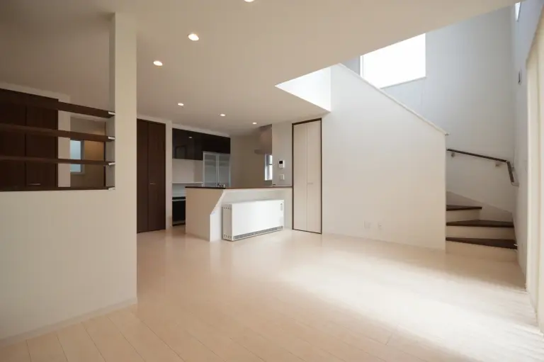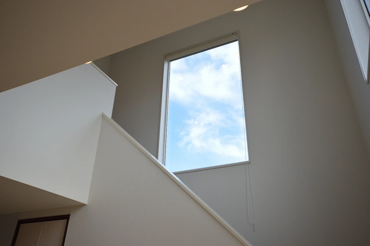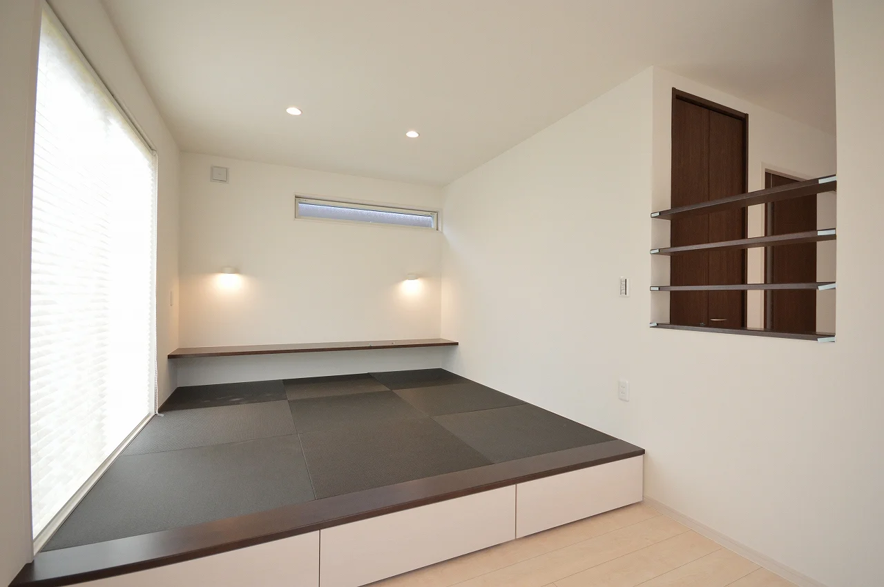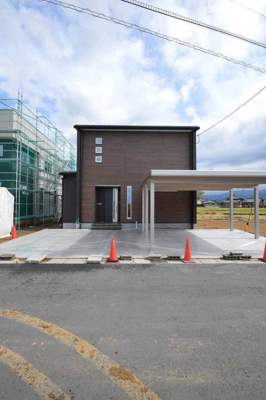 シンプルな箱型の外観。あえて仕切らない畳コーナーと吹抜けによる開放的な空間、一直線につながった水周りの機能的な間取りが特徴的なお家になりました。