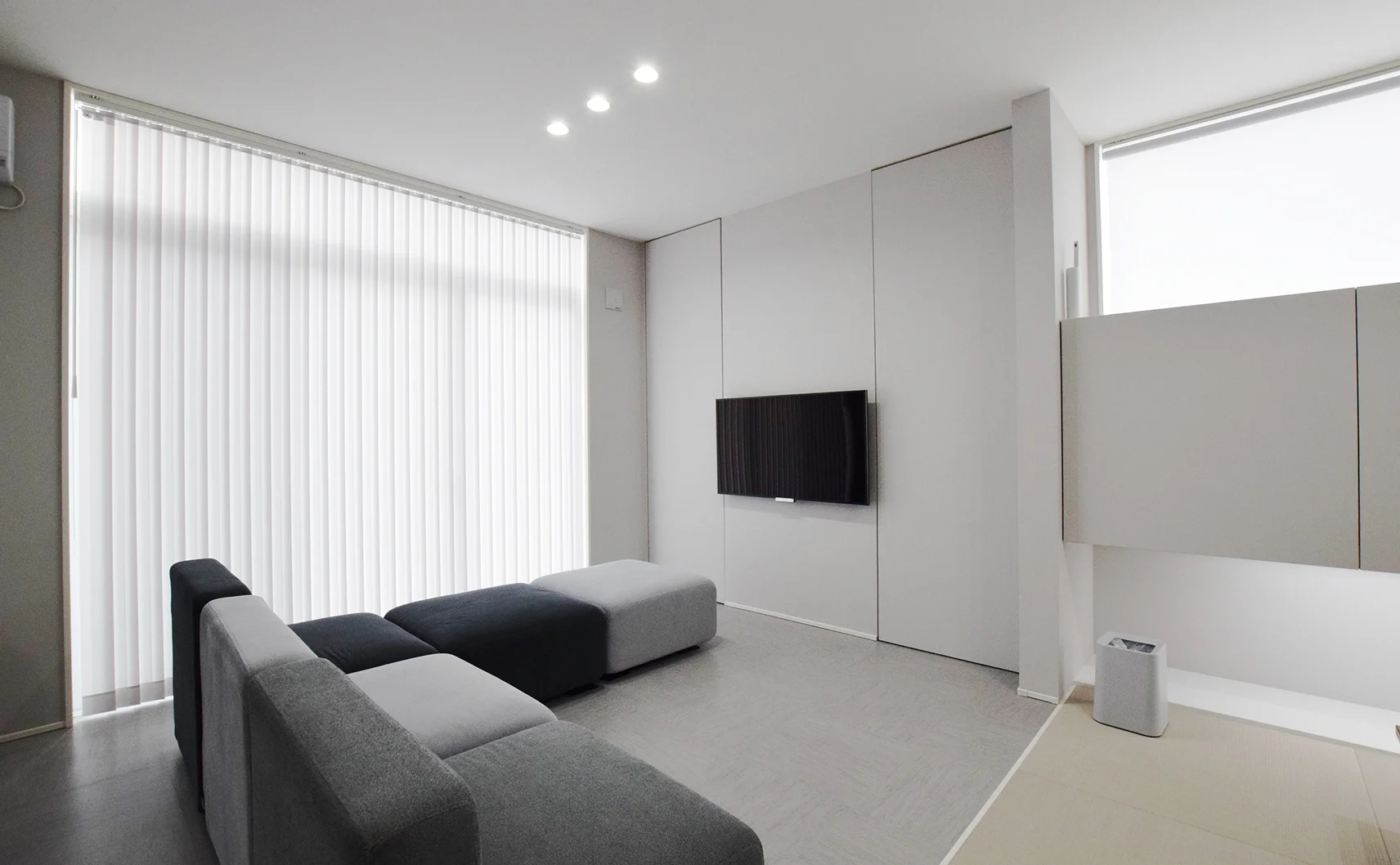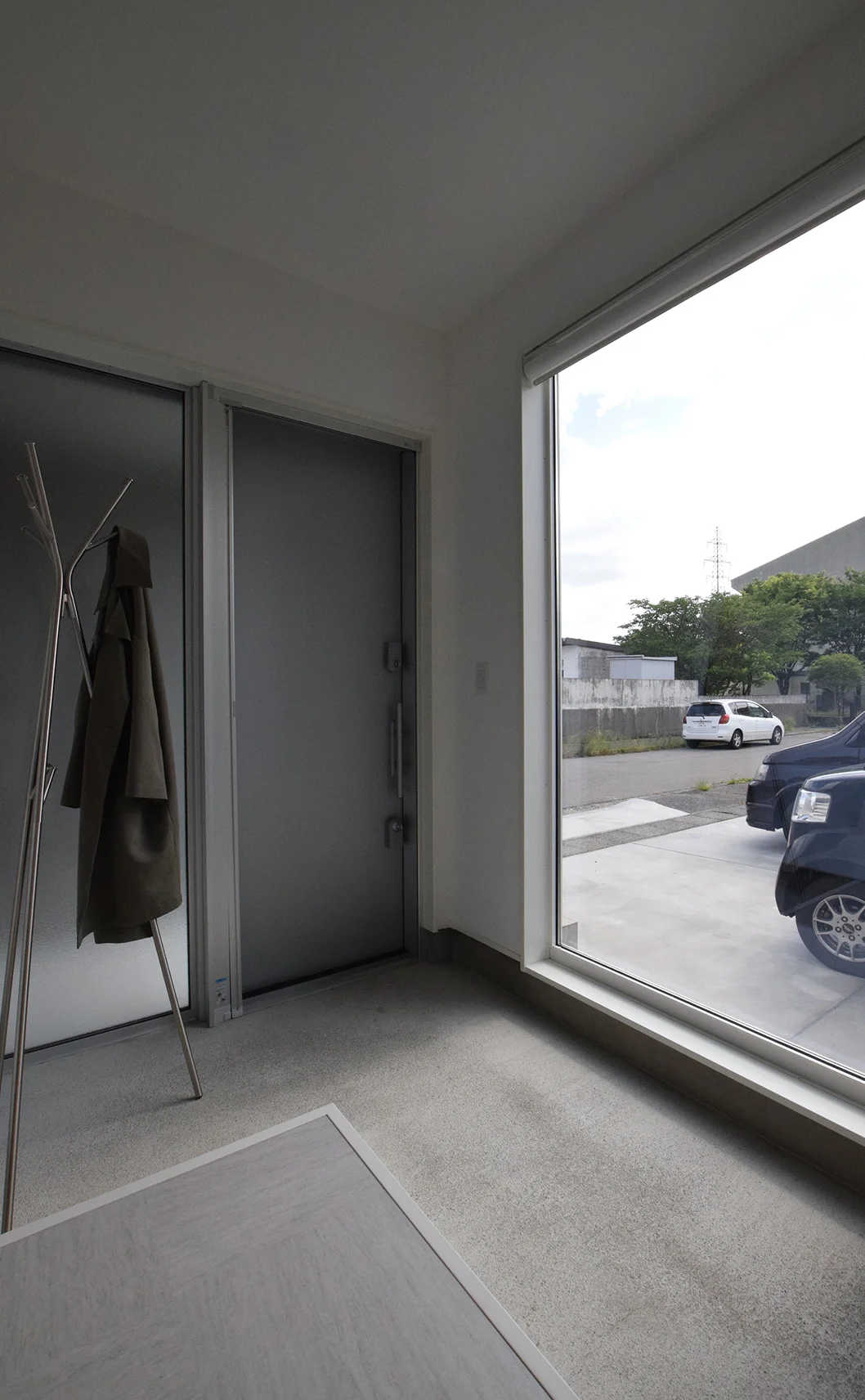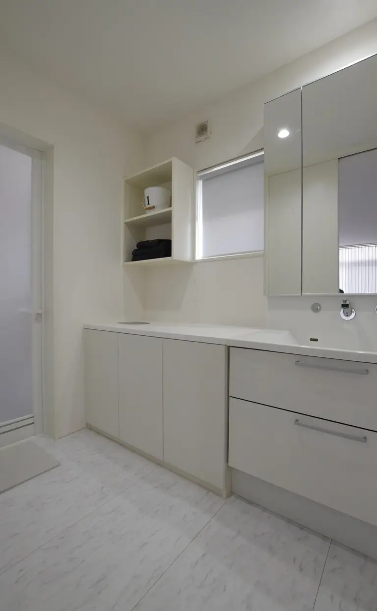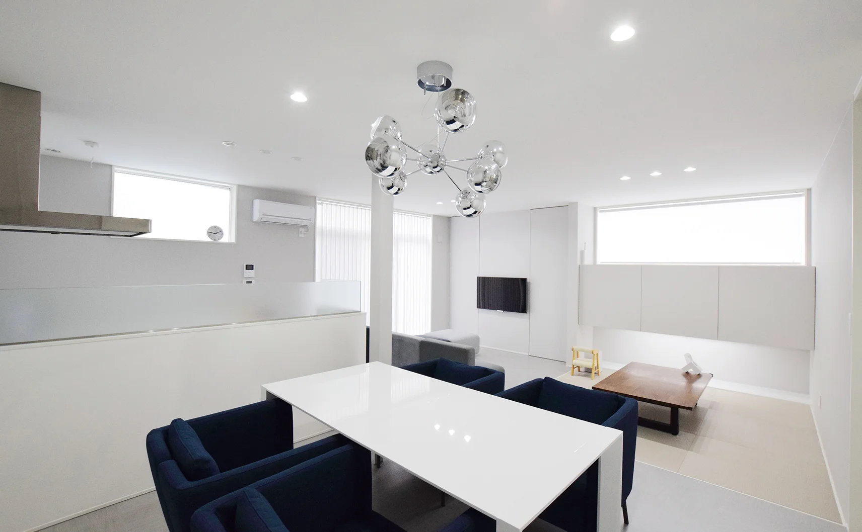 「お家らしいお家を作りたくない。」施主様の一言から始まった、シンプルで無機質な空間づくりの追及。家族専用のシュークロークやパントリー、壁と同色の造作収納に生活用品や家電をすべて納めることで、スタイリッシュな空間を実現しました。