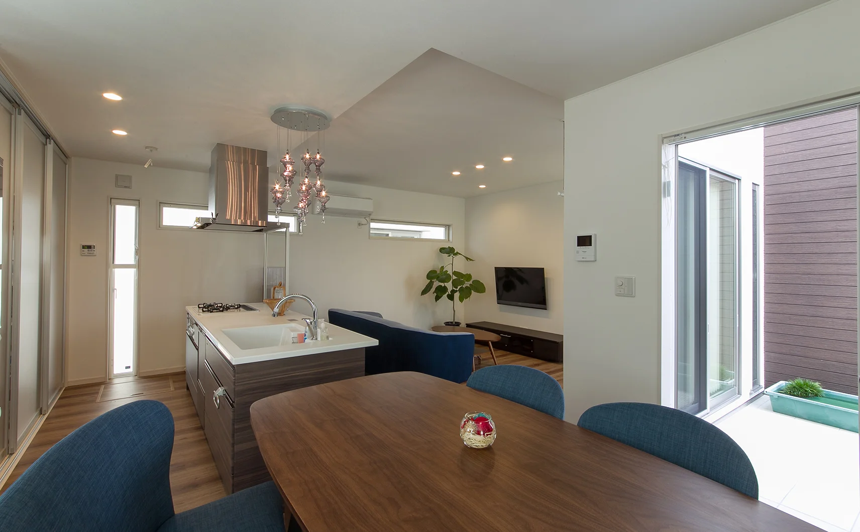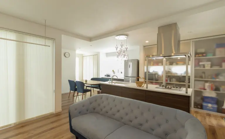 中庭からの柔らかい光がLDKに差し込み、明るく解放的な空間を演出します。