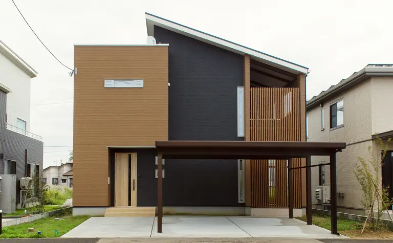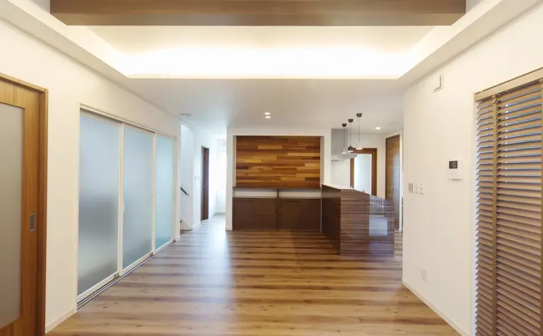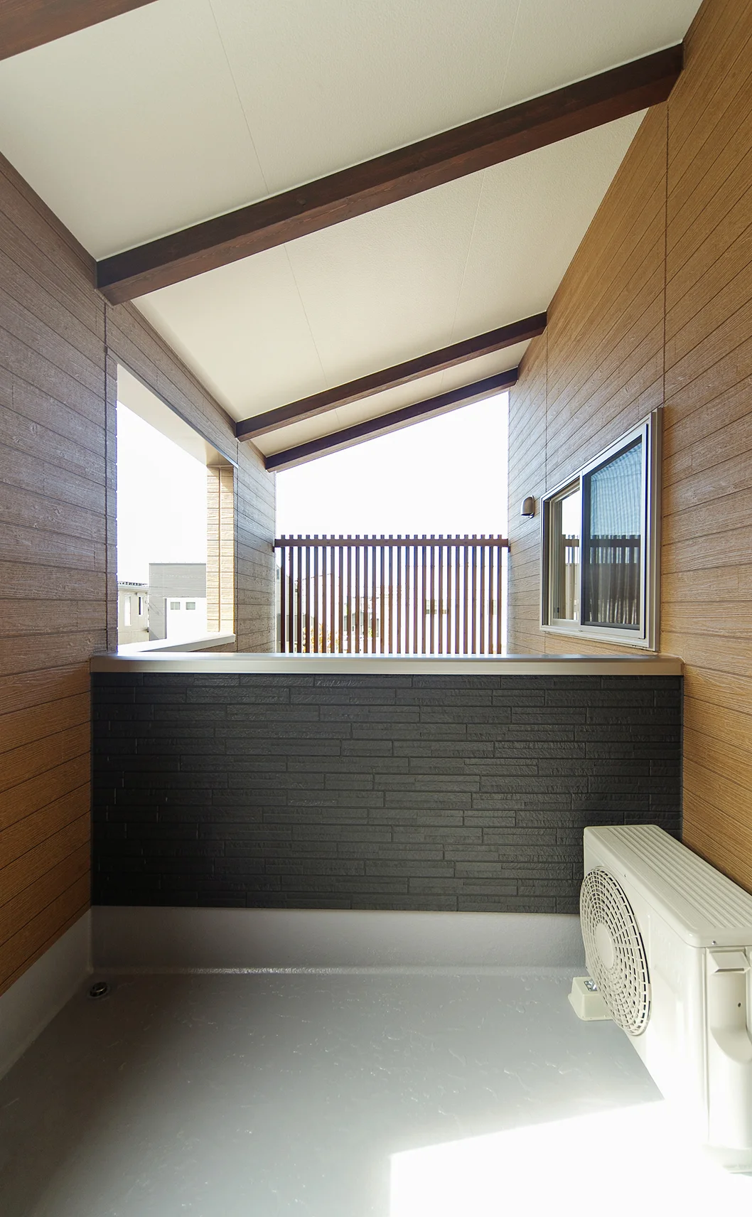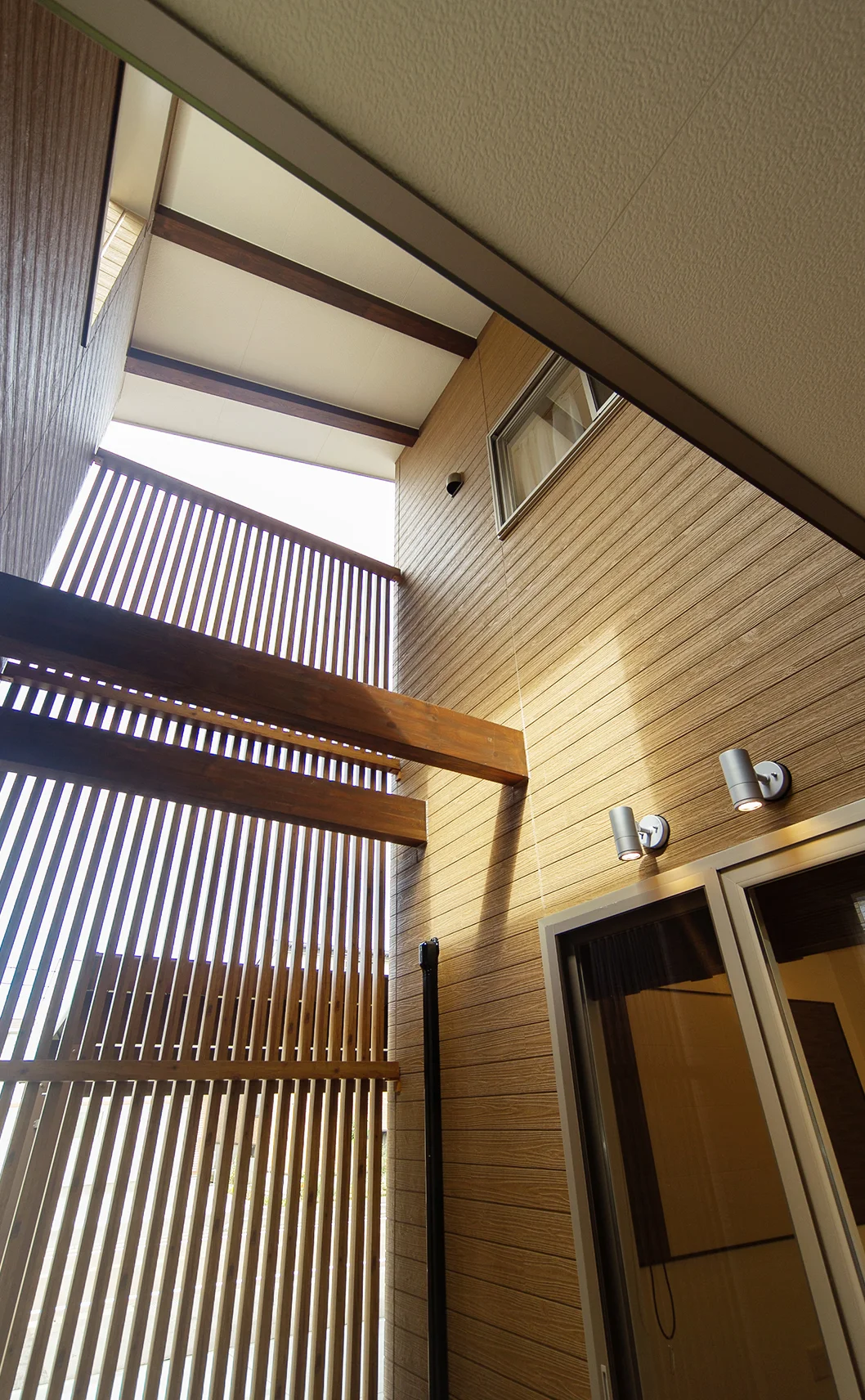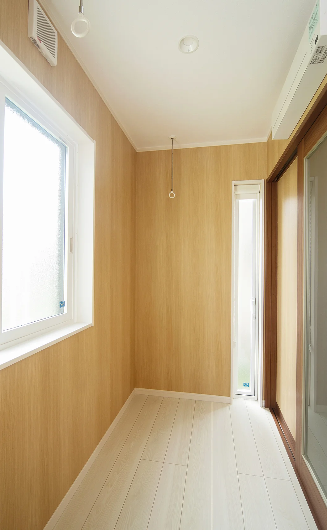 メインリビングを中心に家族が繋がるレイアウト構成は、シンプルな外観とのギャップが良い意味で心地よい。内と外をつなぐテラスが生活にリズムを刻み、数値以上に広々とした印象を与える。ファミリークローゼット、サンルームなど便利な要素も組み込み、居住空間も考慮した住まい。