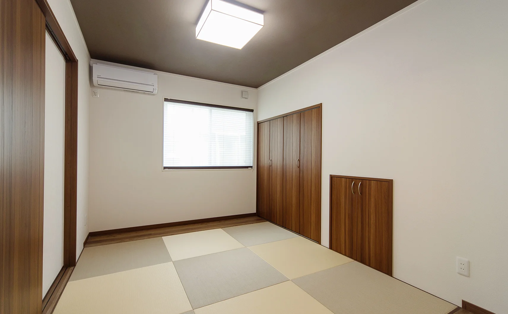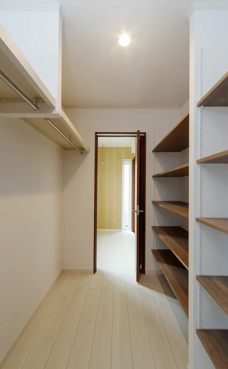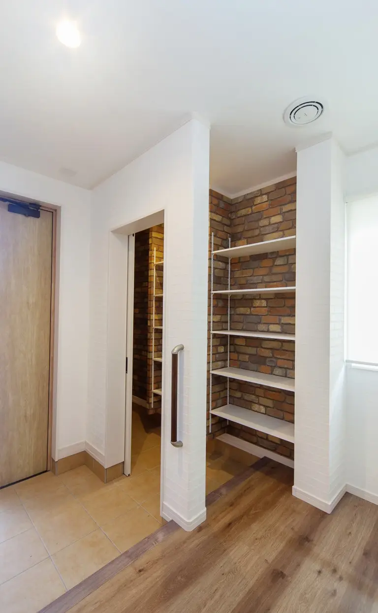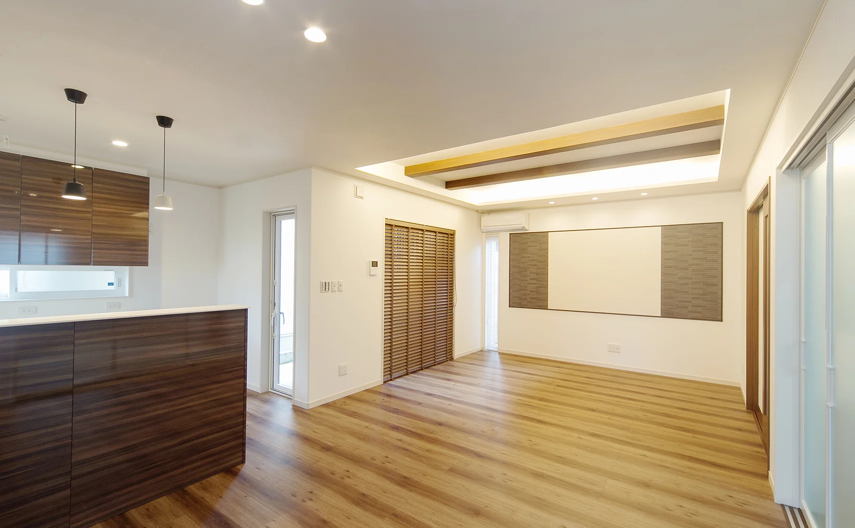 メインリビングを中心に家族が繋がるレイアウト構成は、シンプルな外観とのギャップが良い意味で心地よい。内と外をつなぐテラスが生活にリズムを刻み、数値以上に広々とした印象を与える。ファミリークローゼット、サンルームなど便利な要素も組み込み、居住空間も考慮した住まい。