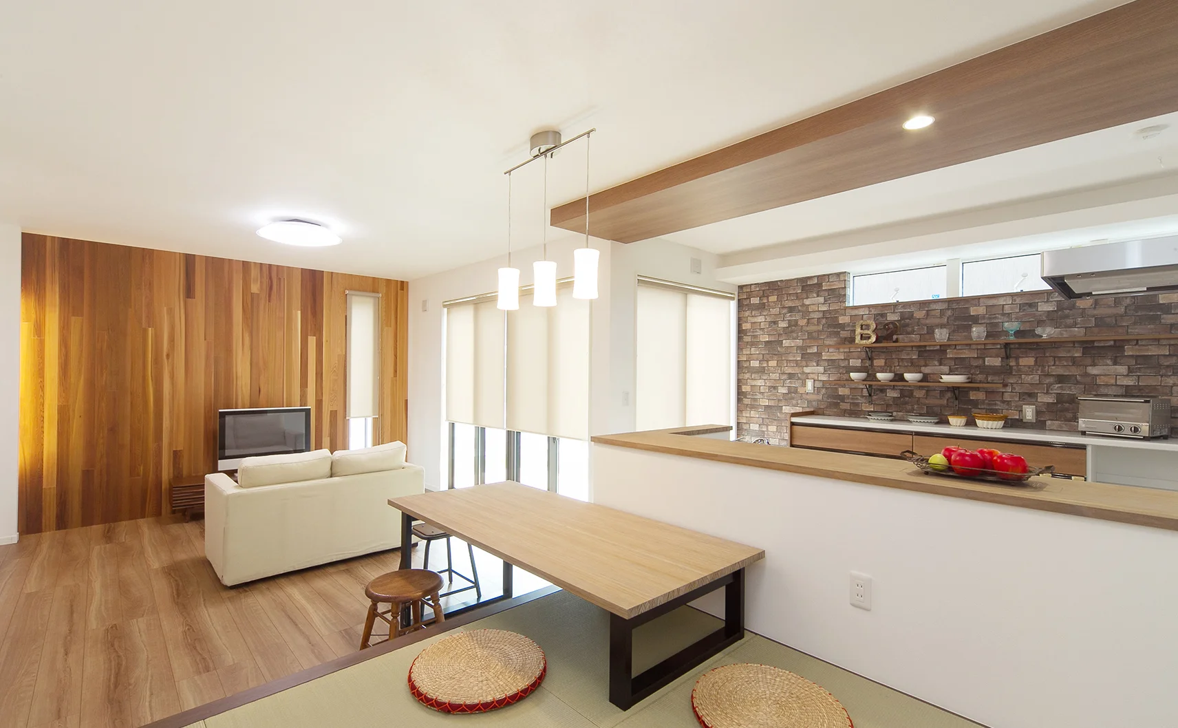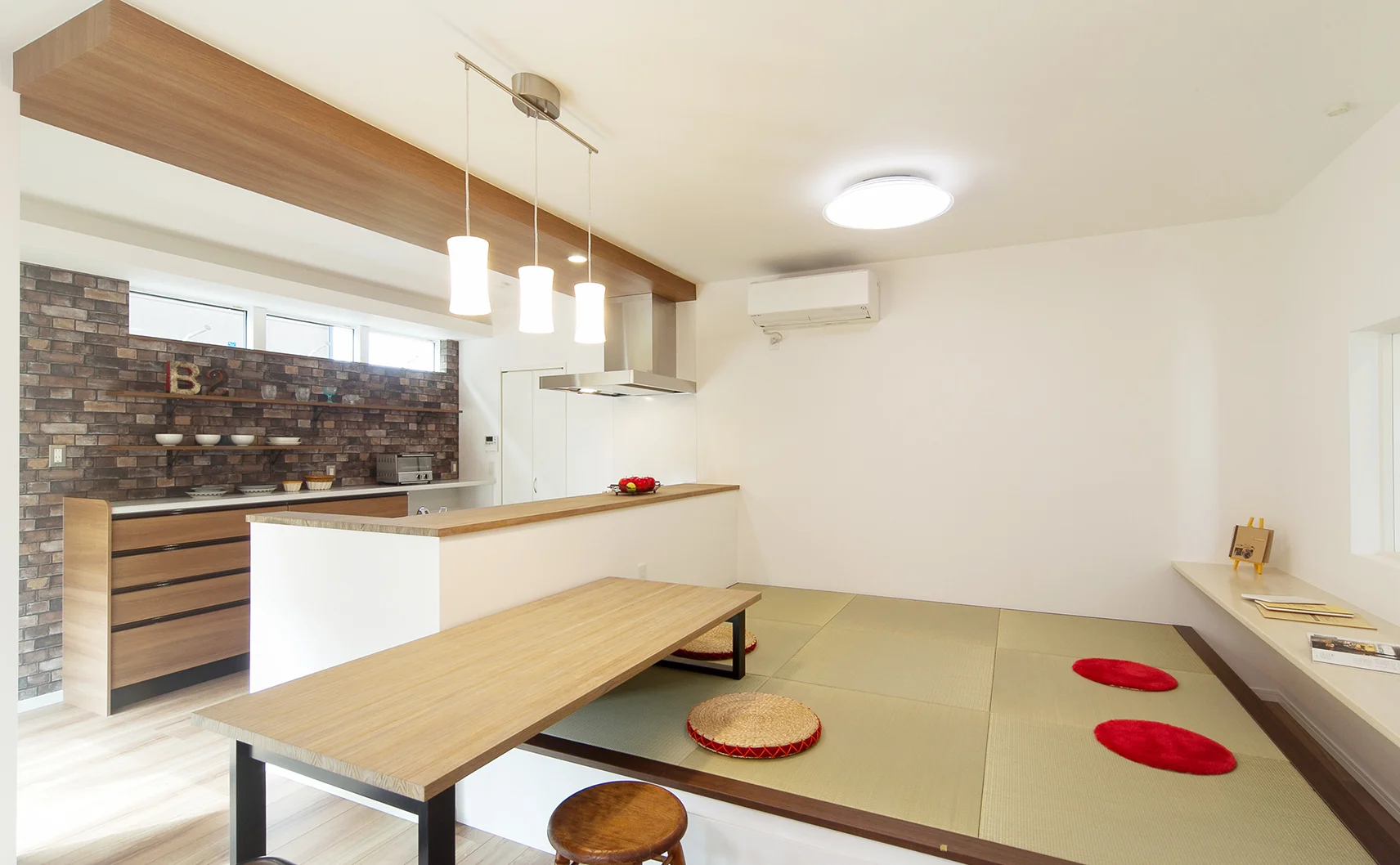ブリックタイルが目を惹くインダストリアル風キッチンと、小上がりの畳ダイニングを融合させたダイニングキッチンの新しいカタチ。