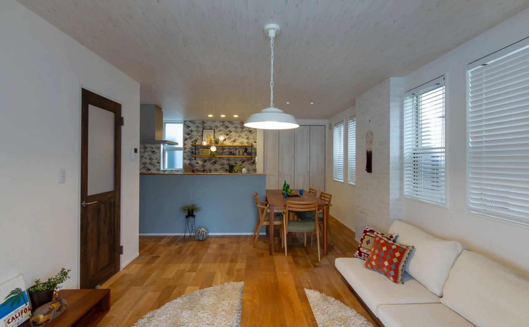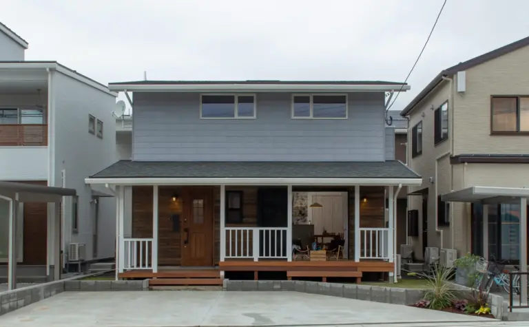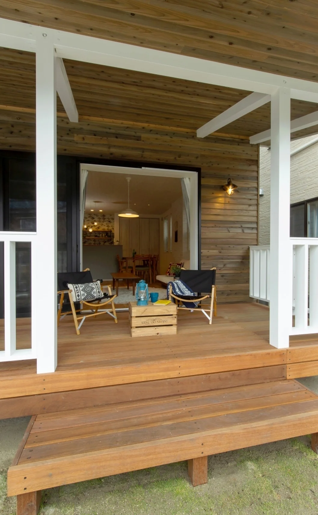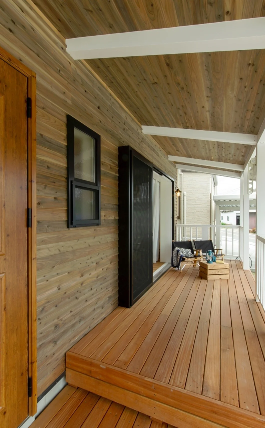 中と外を繋ぐカヴァードポーチは、木のぬくもり溢れる外観を演出。リビングはアンティークな家具や小物が似合う空間に。表し梁や扉、吊り戸棚など色調を統一することで、一体感のあるデザインを実現しています。