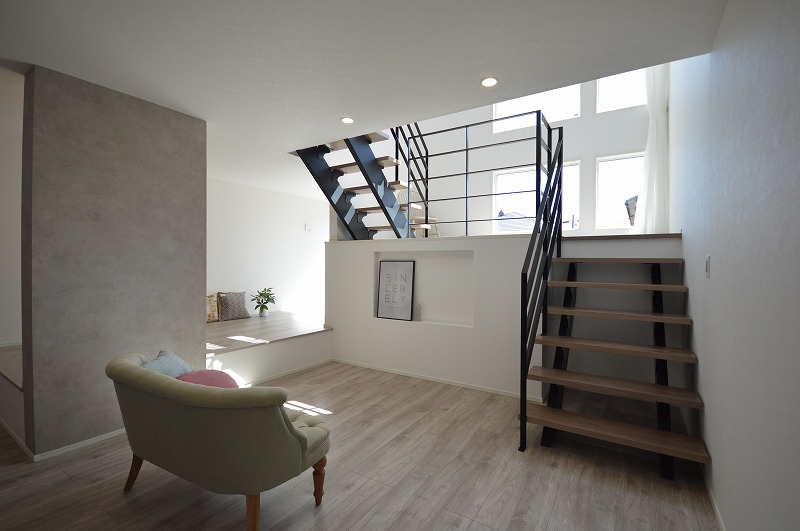 リビングから見上げれば、スケルトン階段の先に光が降り注ぐスキップフロアが浮かび上がります。